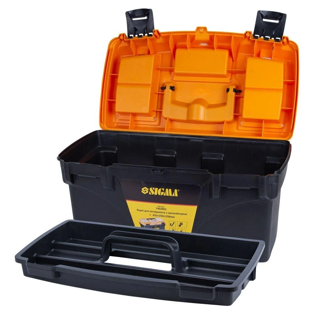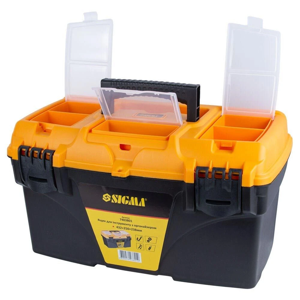 Ящик для інструменту з органайзером 432×250×238мм SIGMA (7403801) призначений для зберігання, транспортування, перенесення і зручного доступу до ручного інструменту. Допомагає системно організувати зберігання дрібних деталей: кріплення, шайб, гайок та інших дрібниць. Простота в пошуку необхідних деталей забезпечується наявністю декількох секцій. Функціональний і знаходить застосування в багатьох сферах діяльності: перенесення індивідуальних інструментів, комплектація наборів інструментів і дрібних деталей для домашнього майстра, забезпечення працівників комунальних служб комплектом устаткування, при комплектації необхідного набору інструментів для автомобіля і ін.