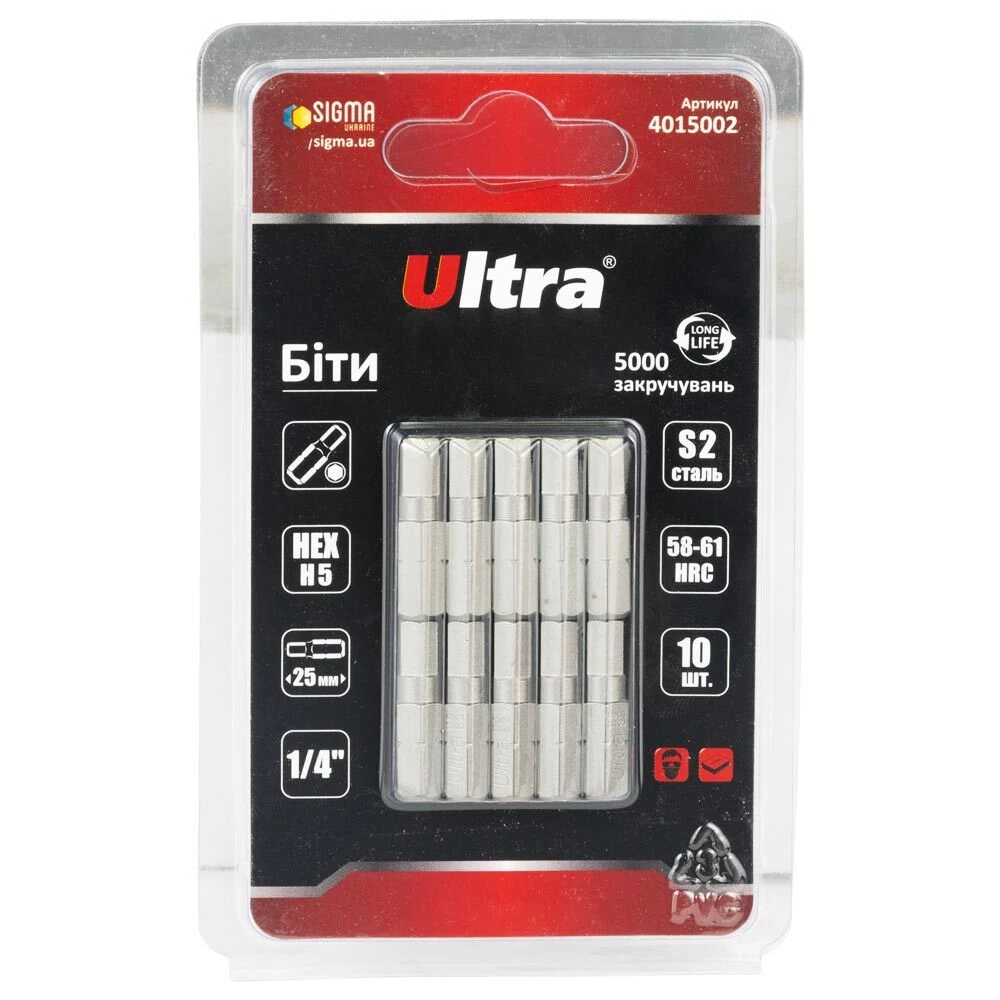 Біти HEX 5×25мм ¼" 10шт S2 (блістер) ULTRA (4015002) призначені для професійного використання. Виготовлені з легованої інструментальної сталі S2 з поверхневим зміцненням до твердості 58-61 HRC струмами високої частоти (СВЧ). Мають проточенну головну частину для роботи у вузьких місцях.
