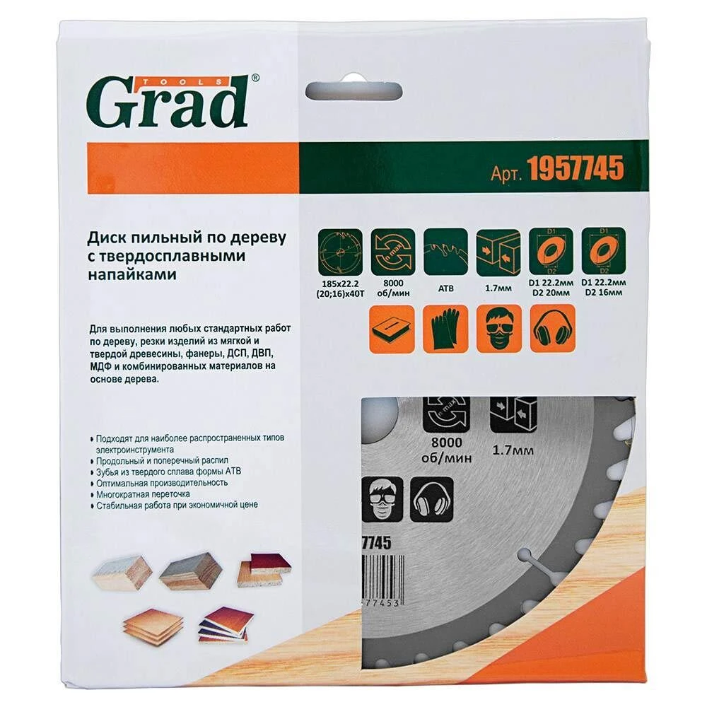 Диск пиляльний по дереву з твердосплавними напайками Ø185×22.2 (20; 16)×40Т, 8000об/хв GRAD (1957745) призначений для виконання будь-яких стандартних робіт по дереву, різання виробів з м'якої і твердої деревини, фанери, ДСП, ДВП, МДФ і комбінованих матеріалів на основі дерева. Додатковою перевагою є можливість заміни і заточування зуба.