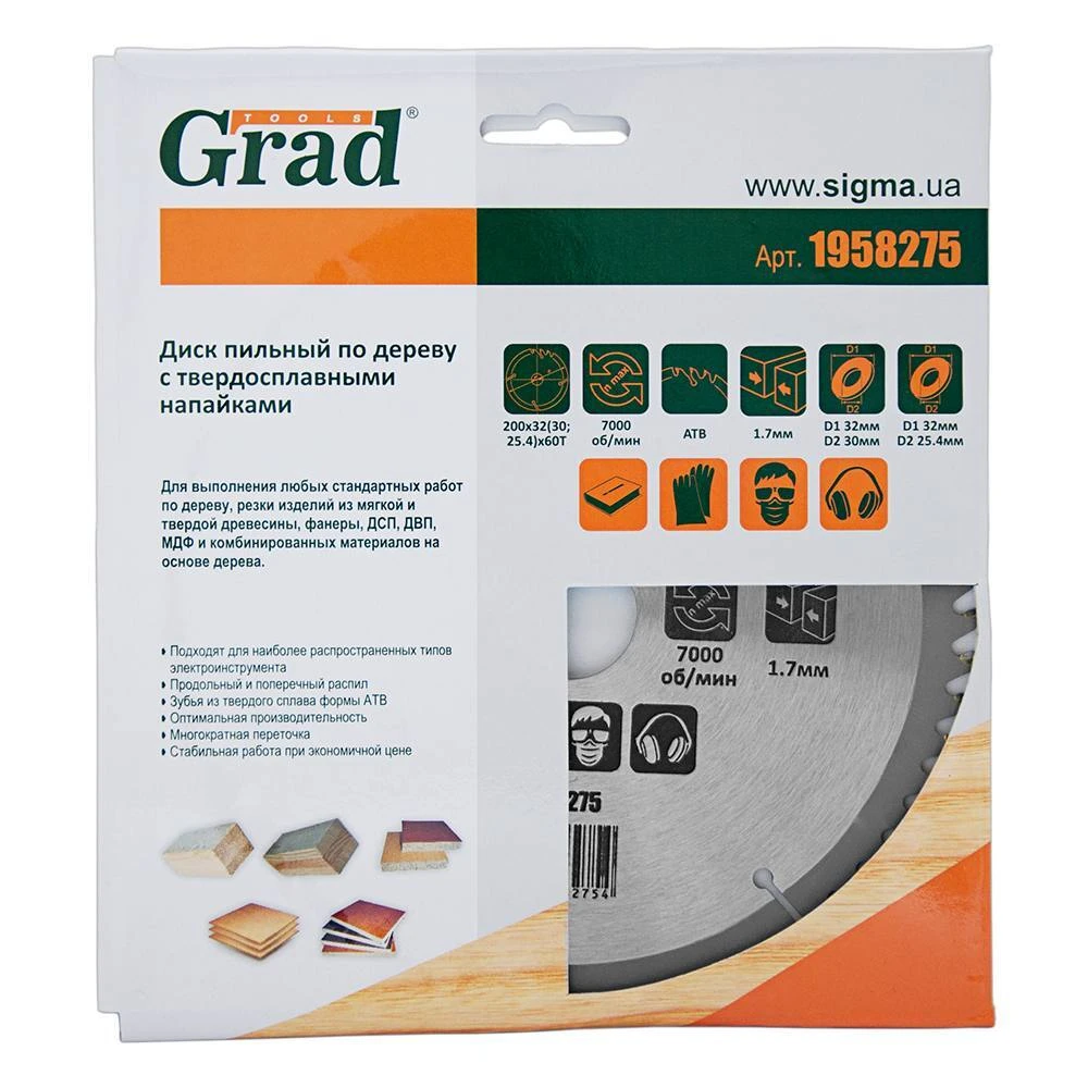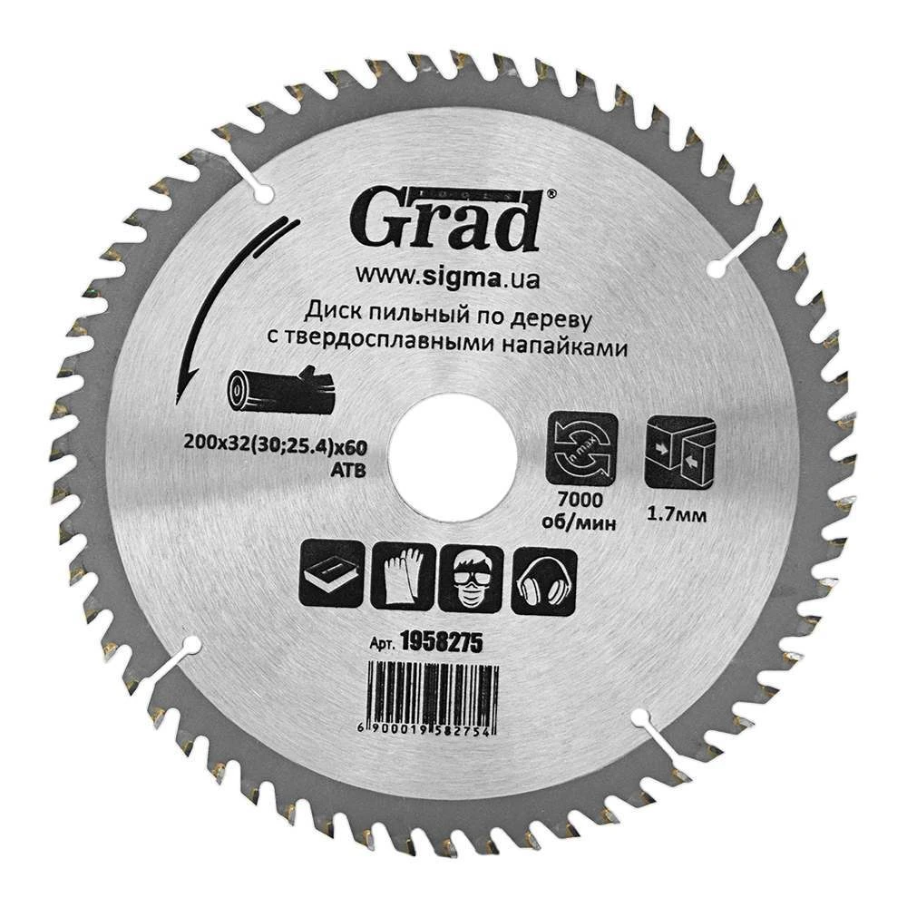 Диск пиляльний по дереву з твердосплавними напайками Ø200×32 (30; 25.4)×60Т, 7000об/хв GRAD (1958275) призначений для виконання будь-яких стандартних робіт по дереву, різання виробів з м'якої і твердої деревини, фанери, ДСП, ДВП, МДФ і комбінованих матеріалів на основі дерева. Додатковою перевагою є можливість заміни і заточування зуба.