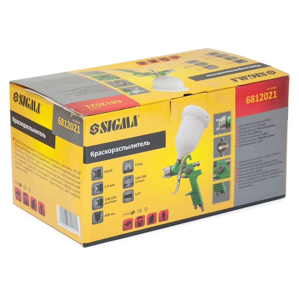Професійний Фарборозпилювач Ø1.4 з в/б (зелений) SIGMA (6812021) системи HVLP (великий обсяг, низький тиск) з верхньою подачею фарби. Дуже добре підходить для застосування в автомалярних майстерень, СТО, в меблевому виробництві, в будівництві і в інших галузях.