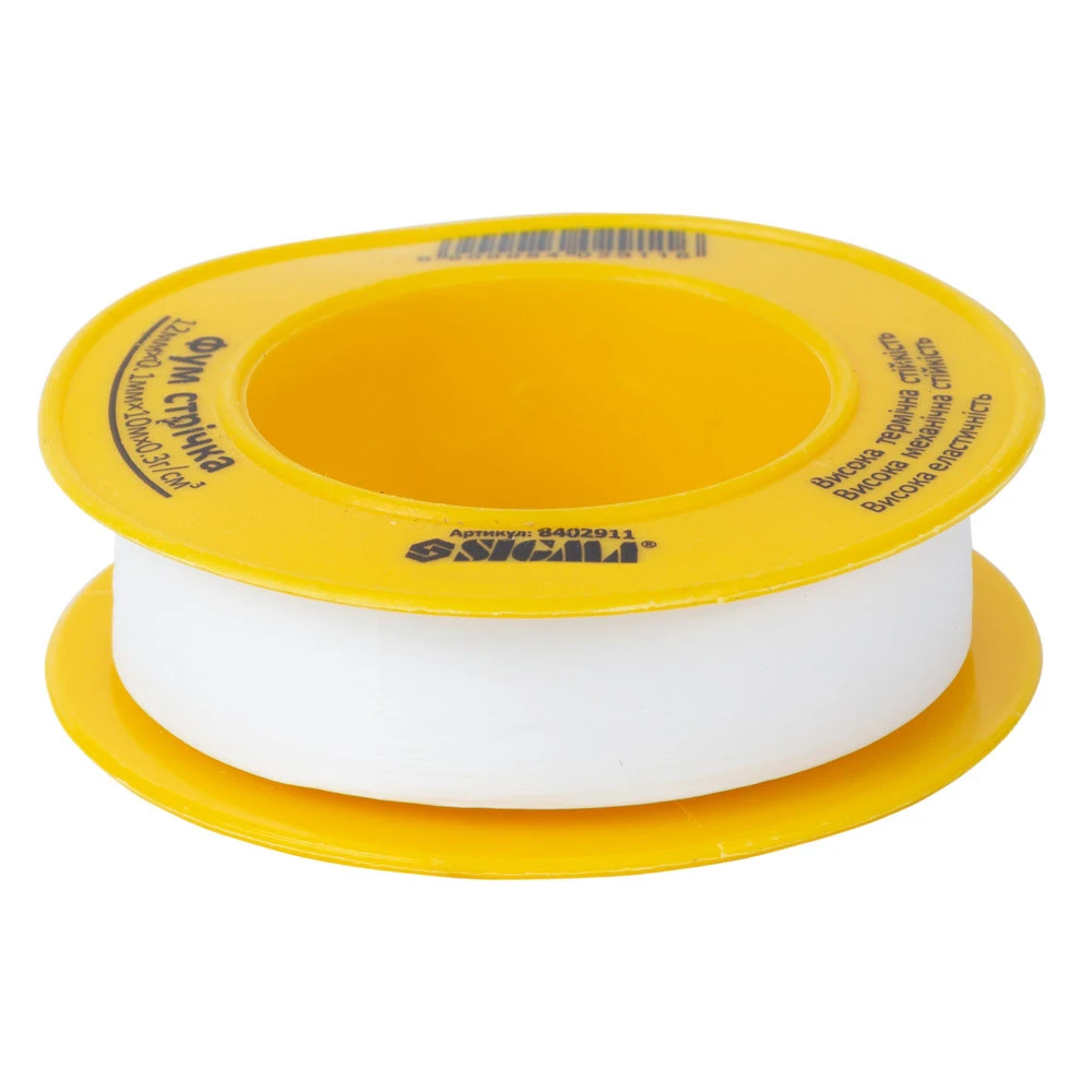Фторопластова (ФУМ) стрічка 0.1мм×12мм×10м SIGMA (8402911) або фторопластовий ущільнювачий - це тонкий синтетичний ущільнювач, що випускається у вигляді стрічки, як правило, має напівпрозорий або матовий відтінок. Завдяки вмісту фтору, фум стрічка має досить високу механічну і термічну стійкість. Вона не старіє, не рветься при розтягуванні і не втрачає своїх властивостей під впливом агресивного хімічного середовища або високої температури. Застосовується для ущільнення трубопроводів загальнопромислового типу або для систем, що працюють агресивними хімічними середовищами.