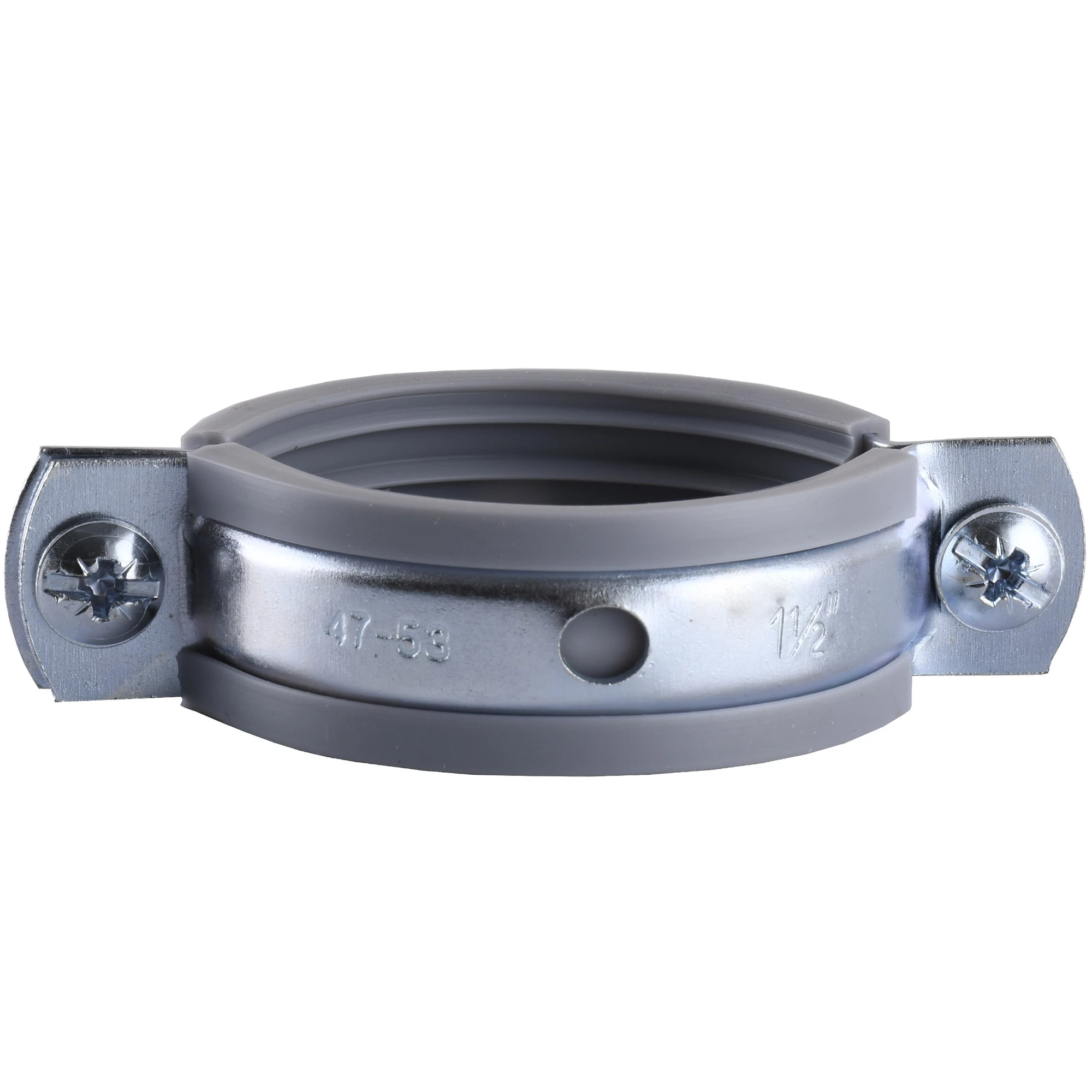 Металевий хомут, комплект - CR 1 1/2″ (47-53мм) - це кріпильний виріб, що складається з двох половинок, зі стяжними болтами, а також оснащене вібро - і звукоізолюючим профілем і привареною сполучної гайкою. Також хомути укомплектовані шпилькою-саморезом і пластиковим дюбелем, що дозволяють провести монтаж труби до нерухомої горизонтальної або вертикальної поверхні.