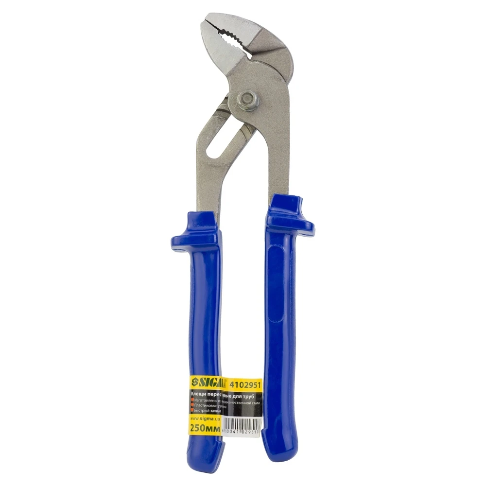 Кліщі переставні для труб 250мм із синіми ручками SIGMA (4102951) застосовуються для захоплення та утримання різних за формою та розміром предметів при виконанні монтажних та інших робіт, можуть використовуватися як трубний розвідний ключ. Виготовлені із високоякісної сталі. Ергономічні рукоятки з протиковзким покриттям виключають прослизання інструменту в руці.