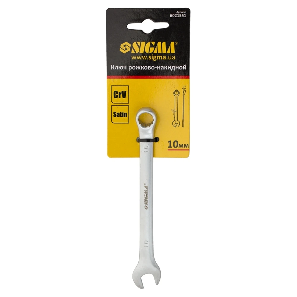 Ключ ріжково-накидний 10мм CrV satine з підвісом SIGMA (6021551) - рожково-накидні ключі є необхідним інструментом при складанні і розбиранні болтових з'єднань, що мають шестигранний профіль. Призначені для монтажу різьбових з'єднань і обслуговування кріплення, який відповідає розміру ключа.