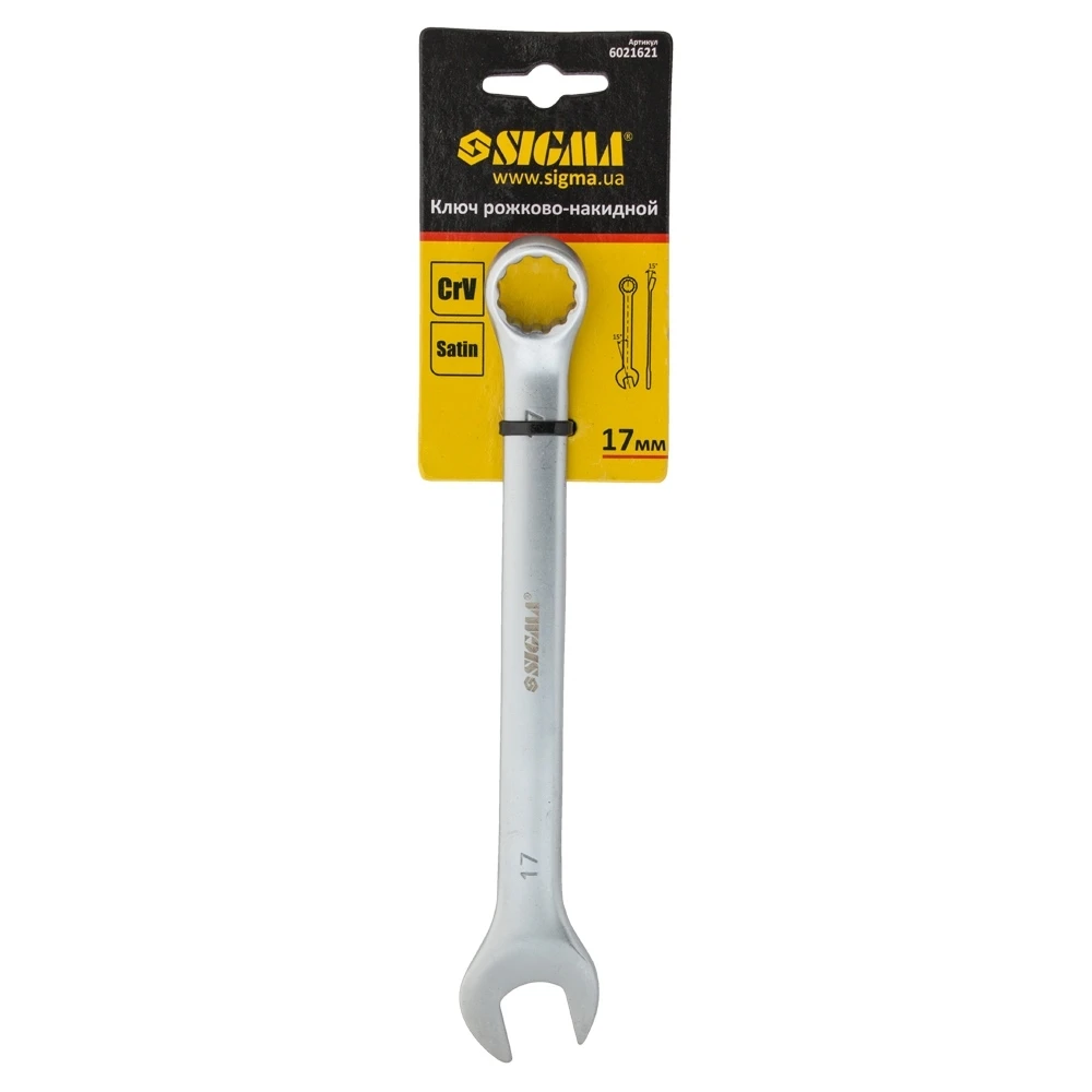 Ключ ріжково-накидний 17мм CrV satine з підвісом SIGMA (6021621) - рожково-накидні ключі є необхідним інструментом при складанні і розбиранні болтових з'єднань, що мають шестигранний профіль. Призначені для монтажу різьбових з'єднань і обслуговування кріплення, який відповідає розміру ключа.