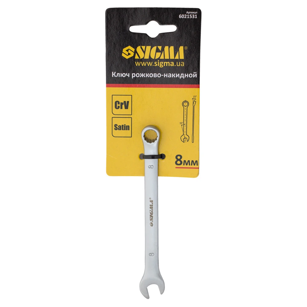 Ключ ріжково-накидний 8мм CrV satine з підвісом SIGMA (6021531) - рожково-накидні ключі є необхідним інструментом при складанні і розбиранні болтових з'єднань, що мають шестигранний профіль.