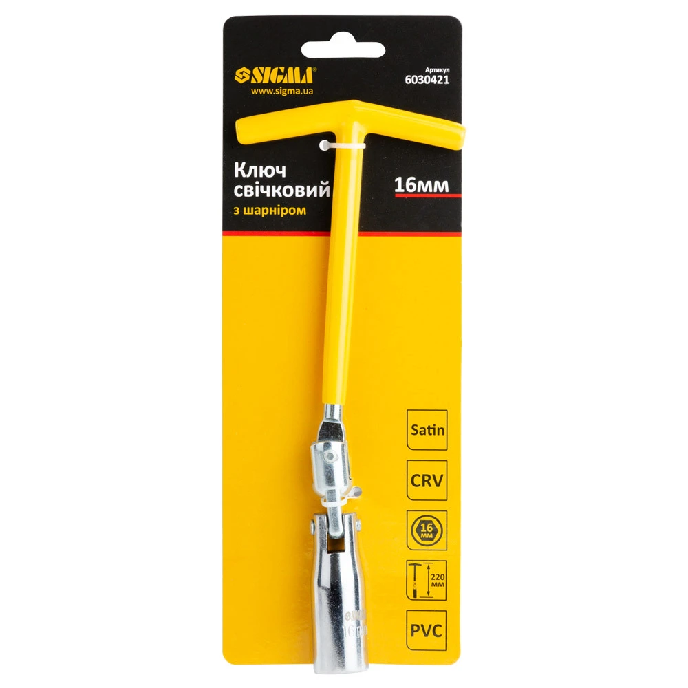 Ключ свічковий з шарніром 16мм SIGMA (6030421) це спеціалізований інструмент, який призначений для монтажу і демонтажу свічок запалювання двигунів внутрішнього згоряння. Даний інструмент використовується як автолюбителями у власних гаражах, так і професійними майстрами по ремонту автомобілів на СТО і шиномонтажі.
