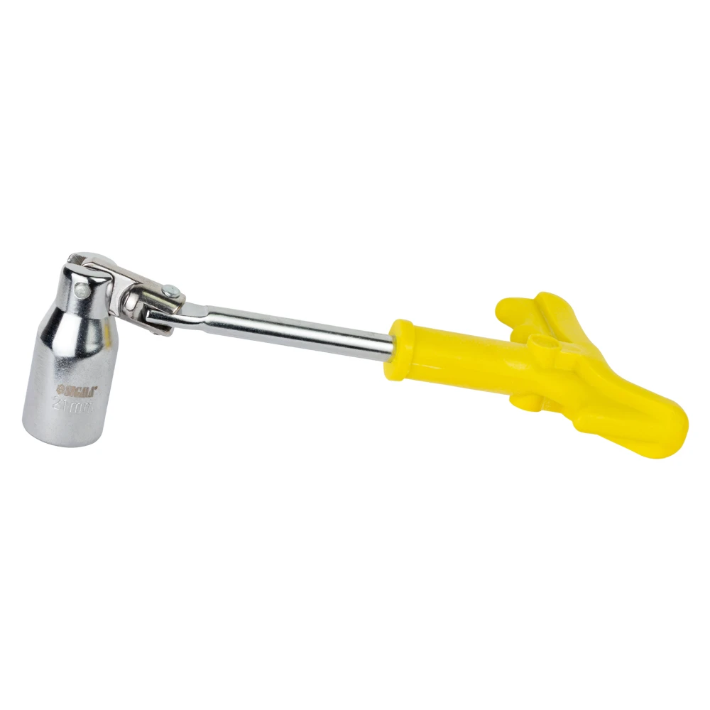 Ключ свічковий з шарніром посилений 21мм SIGMA (6030341) це спеціалізований інструмент, який призначений для монтажу і демонтажу свічок запалювання двигунів внутрішнього згоряння. Даний інструмент використовується як автолюбителями у власних гаражах, так і професійними майстрами по ремонту автомобілів на СТО і шиномонтажі. Усередині головки розташоване гумове кільце, що дозволяє зафіксувати та витягнути свічку без проблем. Гумове кільце також служить в якості амортизатора, пом'якшуючи різкі рухи майстра, запобігаючи злам свічки. Т-подібна посилена пластикова рукоять запобігає прослизанню та дає можливість міцно утримувати ключ в руці. Ключі виготовлені з міцної сталі, що володіє високими експлуатаційними характеристиками. Ключ складається з довгого металевого стрижня, з одного боку якого розташована рукоять, а з іншого - головка з шарніром. Рухоме шарнірне з'єднання робить інструмент більш маневреним, а роботу в обмеженому просторі - більш зручною. Крім того, за рахунок шарніра можна підібрати оптимальний кут, щоб без пошкоджень зняти або встановити свічку. Головка ключа має шестигранний профіль, який ефективно передає зусилля на профіль свічки.