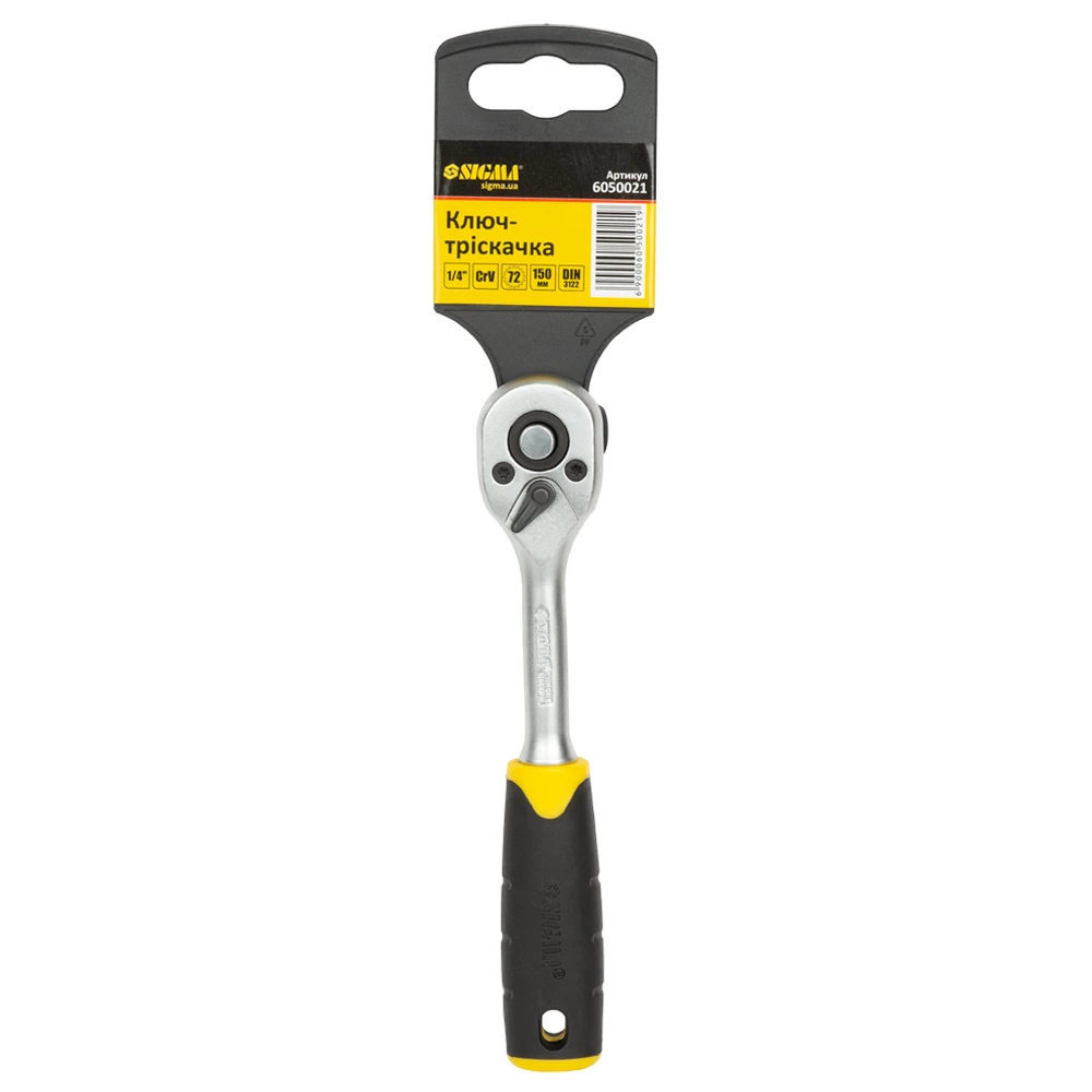 Ключ-тріскачка 1/4'' 150мм 72T CrV Sigma (6050021) з храповим механізмом на 72 зуба. Виконаний з хром-ванадієвої сталі. Використовується для роботи з різьбовими з'єднаннями.