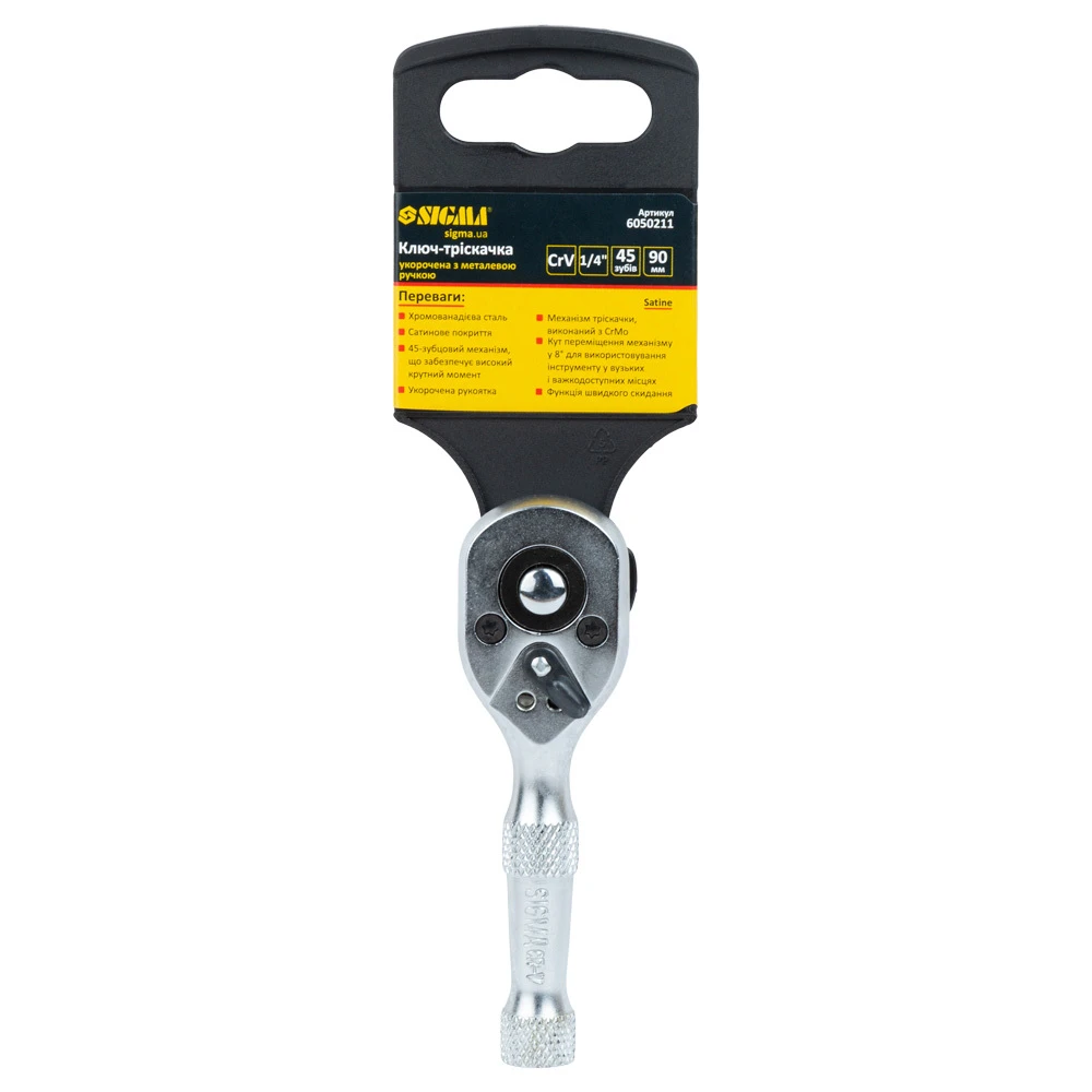 Ключ-тріскачка укорочена з металевою ручкою 1/4" 90мм 45T CrV SIGMA (6050211) - це необхідний інструмент при виконанні робіт з різьбовими з'єднаннями, який повинен бути в арсеналі кожного автослюсаря і майстри. Даний інструмент дозволяє виконувати монтаж / демонтаж різьбових з'єднань за допомогою біт з адаптерами або за допомогою торцевих головок.