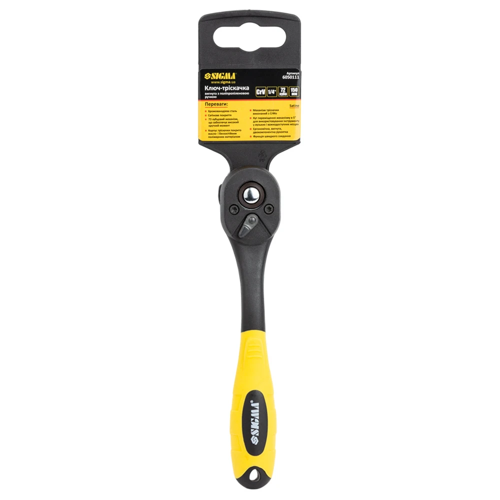 Ключ-тріскачка вигнута з поліпропіленової ручкою 1/4" 150мм 72T CrV SIGMA (6050111) - це ручний інструмент, за допомогою якого можна виконати монтаж / демонтаж різьбових з'єднань. На відміну від стандартних ключів, тріскачка дозволяє оптимізувати роботу, дозволяючи працювати без необхідності переставляти ключ для нового обороту. Сфера застосування даного інструменту дуже широка, так як це дуже корисний інструмент в асортименті кожного автослюсаря, а також для кожного власника авто.