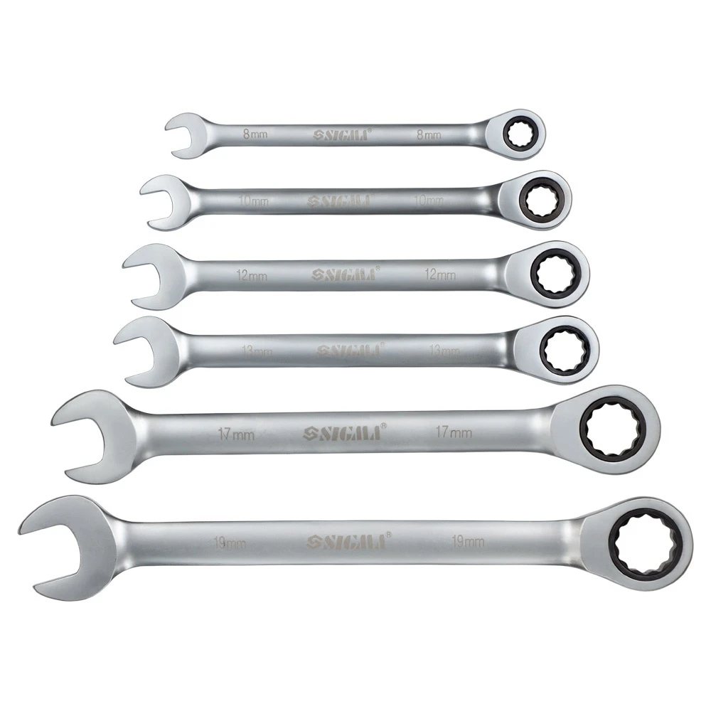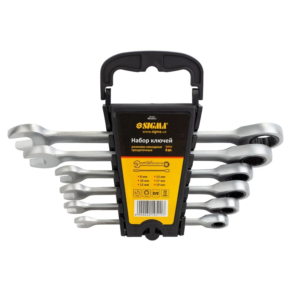 Ключі ріжково-накидні з тріскачкою 6шт (8, 10, 12, 13, 17, 19мм) CrV SIGMA (6010511) - використовується для роботи з болтовими з'єднаннями (для відкручування або закручування гайок і болтів).