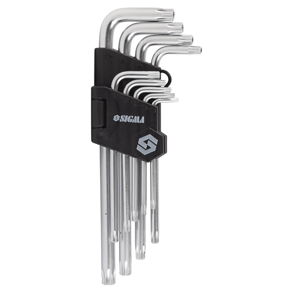 Ключі TORX 9шт T10-T50мм CrV (середні з отвором) SIGMA (4022221) виготовлені з хромванадієвої сталі та укомплектовані в зручні пластмасові футляри.
