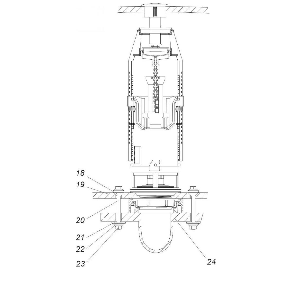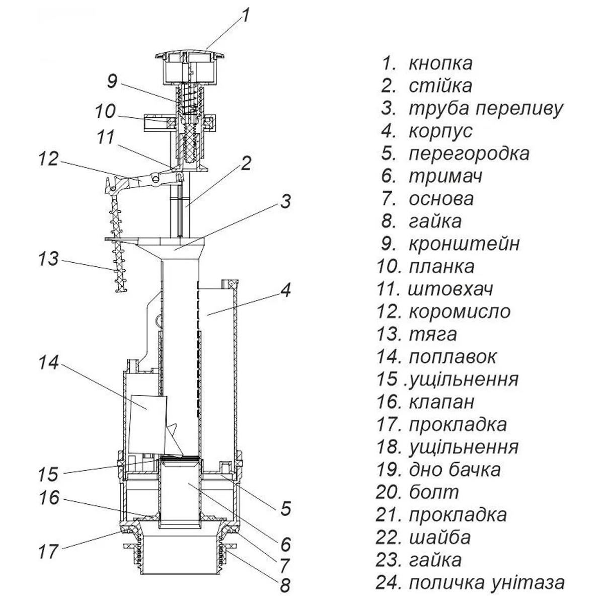 Комплект арматури для змивного бачка з нижнью подачею води, з одним режимом зливу АБк-12