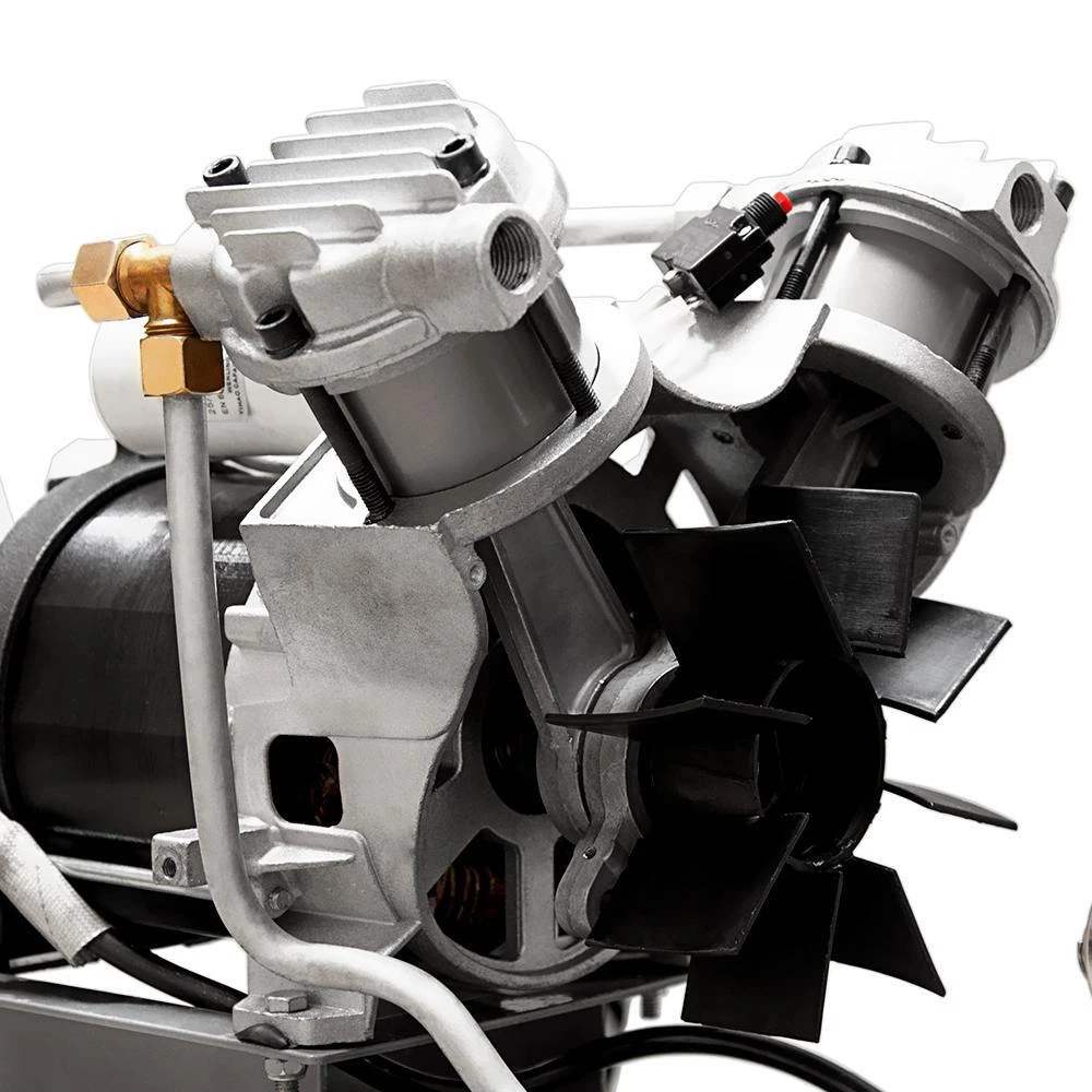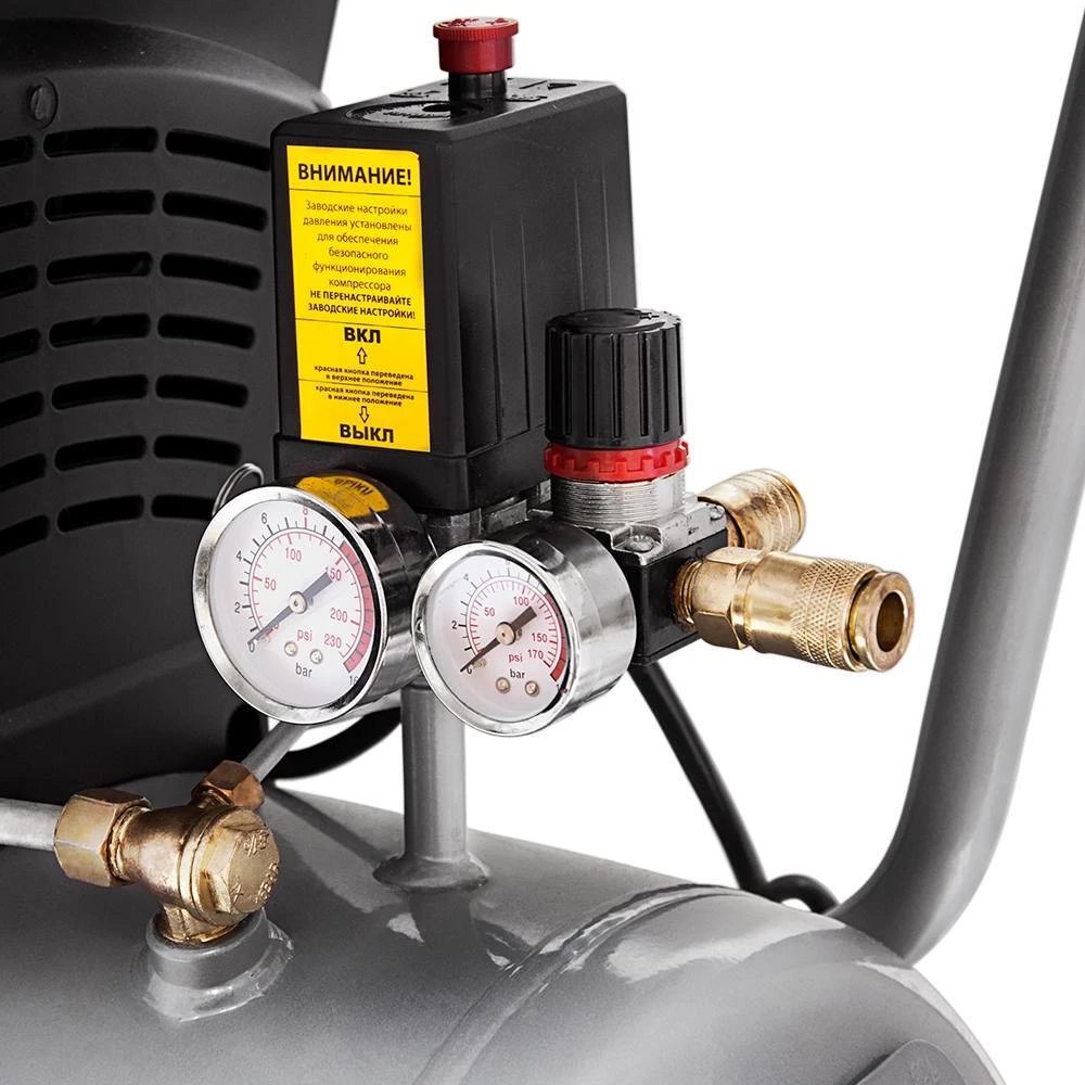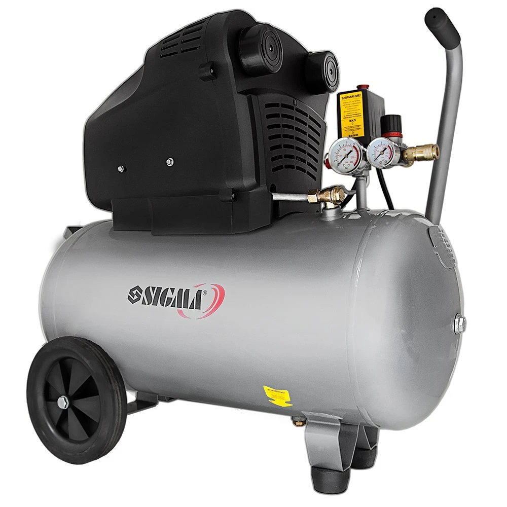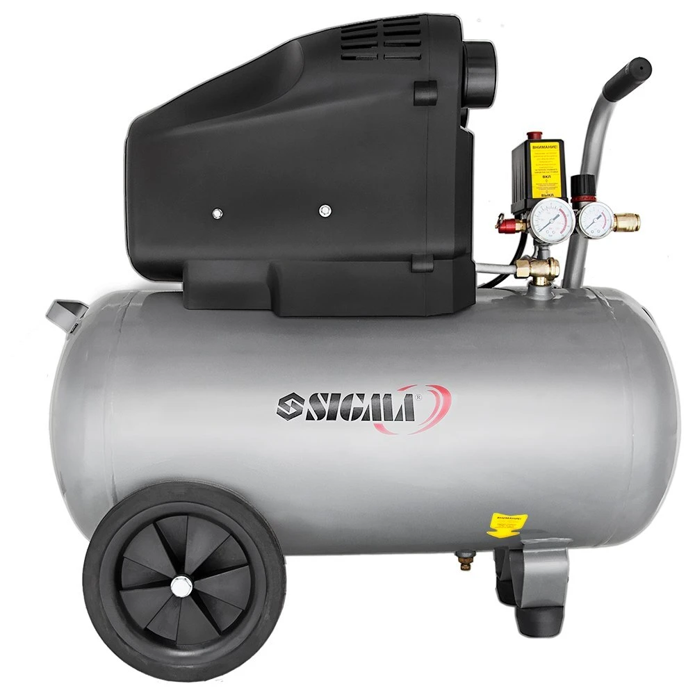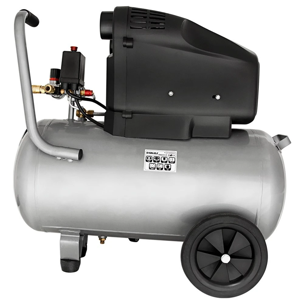 Компресор двоциліндровий безмасляний 2.2кВт 365л/хв 8бар 50л (2 крана) SIGMA (7042311) з двоциліндровим безмасляним двигуном призначений для нагнітання стисненого повітря з подальшою його подачею під тиском в різні типи пневмоінструменту і пневмообладнання. Дана модель компресора працює без масла, тому не вимагає техобслуговування по контролю і доливці масла. Відрізняється чистим повітрям, який не містить будь-любо домішок. Двигун компресора закритий спеціальним кожухом, який запобігає його пошкодження і забруднення. Опорна ніжка забезпечує стійке положення на поверхні, а гумова подушечка знижує рівень вібрації. Модель компресора Sigma 7042311 володіє великою продуктивністю 365л/хв з високим тиском. Застосовується для фарбувальних і обробних робіт, а також в медицині. Ресивер місткістю 50 л дозволяє накопичувати більший обсяг стисненого повітря, що значно зменшує частоту включення двигуна, знижуючи навантаження на компресор і, відповідно, збільшує термін його служби.