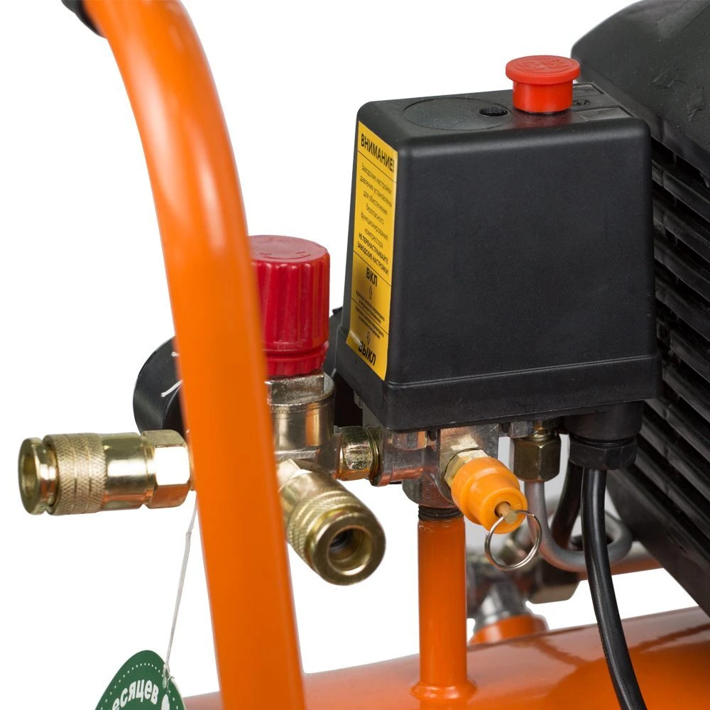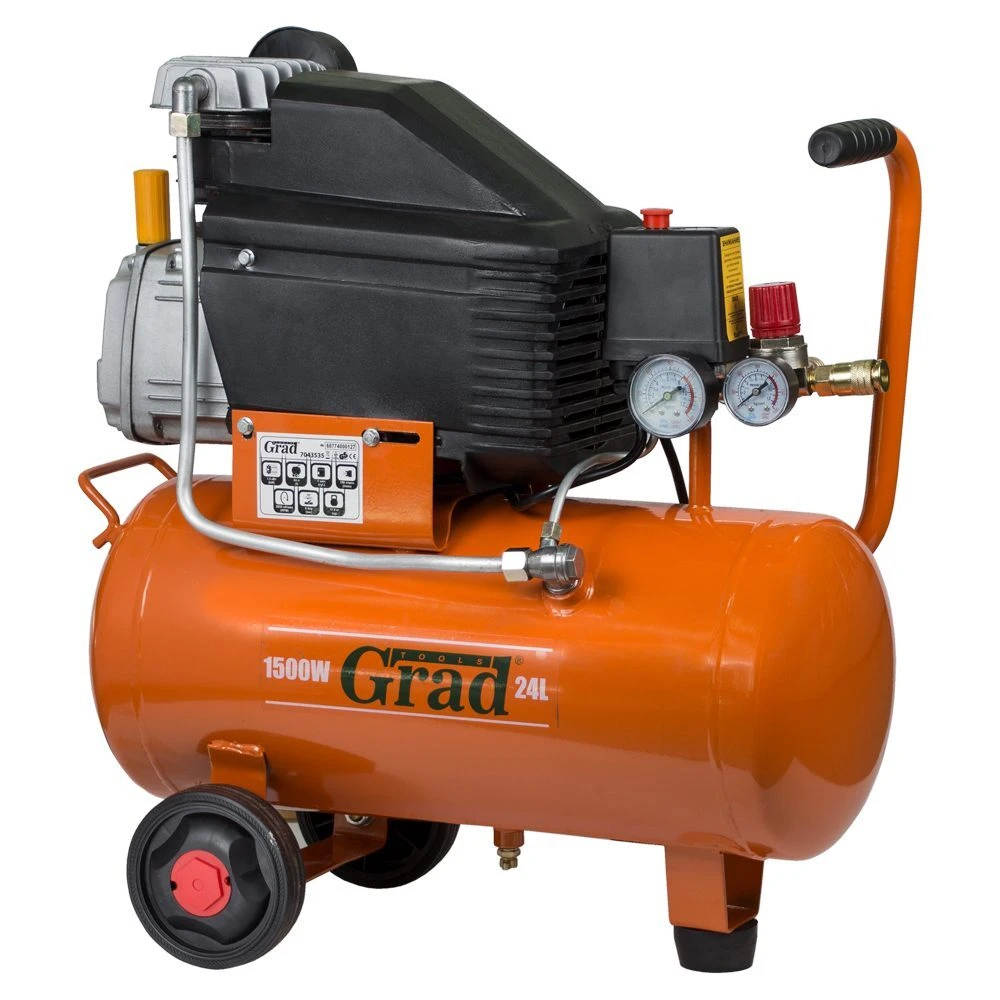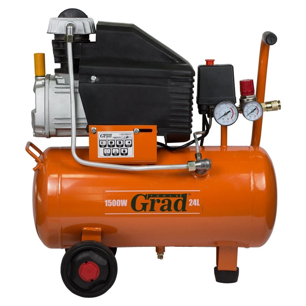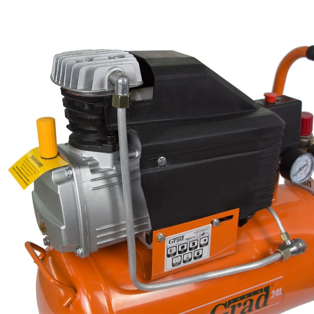 Компресор одноциліндровий 1.5кВт 198л / хв 8бар 24л (2 крана) GRAD (7043535) - сучасний пристрій для нагнітання повітря під тиском. Модель обладнана фільтром вхідного повітря для захисту внутрішніх вузлів від пилу і бруду. Редуктор допомагає виставити оптимальний тиск для ефективної роботи пневмоінструменту. Запобіжний клапан спрацьовує при підвищенні граничного тиску, дозволяючи захистити деталі пневмосистеми від аварійних поломок. У нижній частині ресивера є спеціальна дренажна пробка, яка дозволяє просто і швидко зливати конденсат. Конструкція передбачає колеса, завдяки яким компресор легко і зручно транспортувати по робочому майданчику.