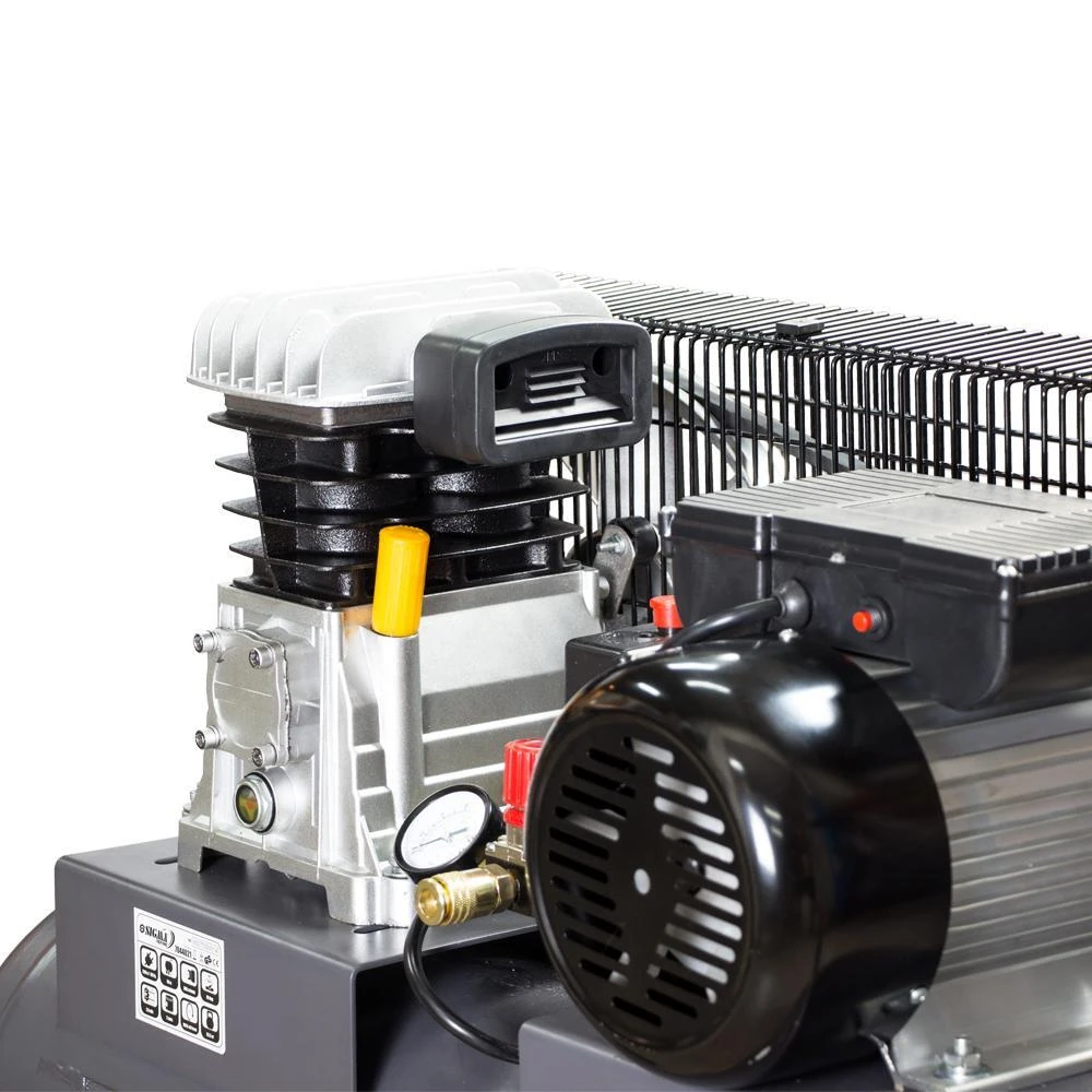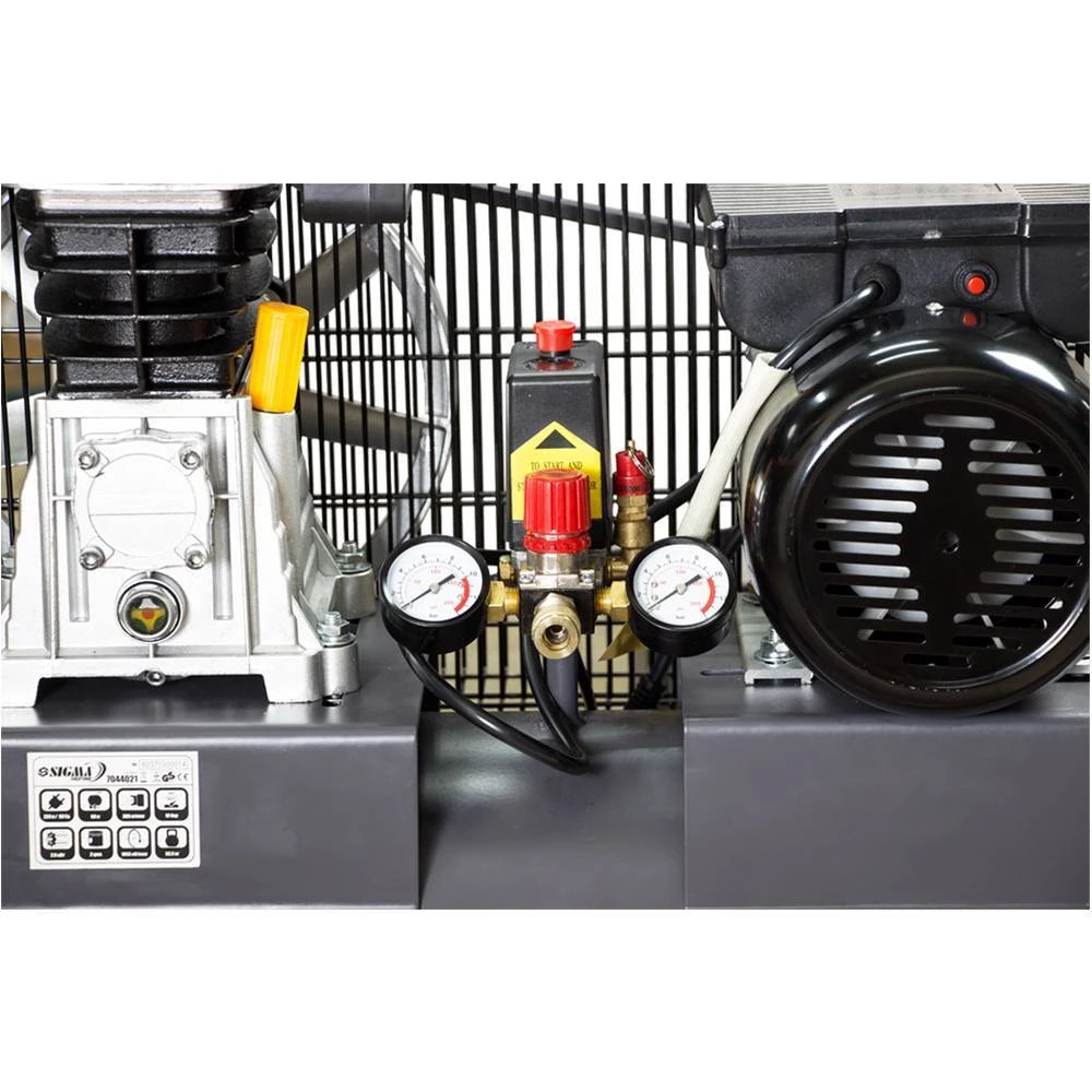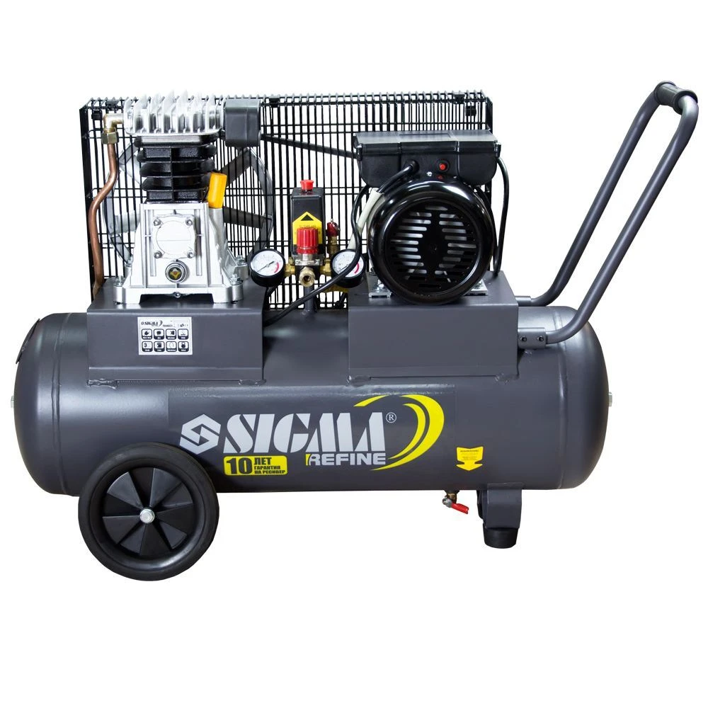 Компресор ремінний двоциліндровий 2кВт 385л/хв 10бар 50л SIGMA REFINE (7044021), призначений для нагнітання стисненого повітря з подальшою його подачею під тиском в різні типи пневмоінструменту і пневмообладнання. Ремінний привід компресора закритий металевим кожухом, який запобігає від попадання сторонніх предметів. Опорна ніжка забезпечує стійке положення на поверхні, а гумова подушечка знижує рівень вібрації. Компресор спроектований для професійного застосування. Застосовується в будівництві і невеликому виробництві, на СТО і майстерень. Ресивер дозволяє накопичувати більший обсяг стисненого повітря, що значно зменшує частоту включення двигуна, зменшуючи навантаження на компресор і відповідно збільшує термін його служби.