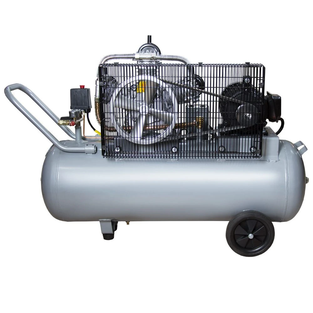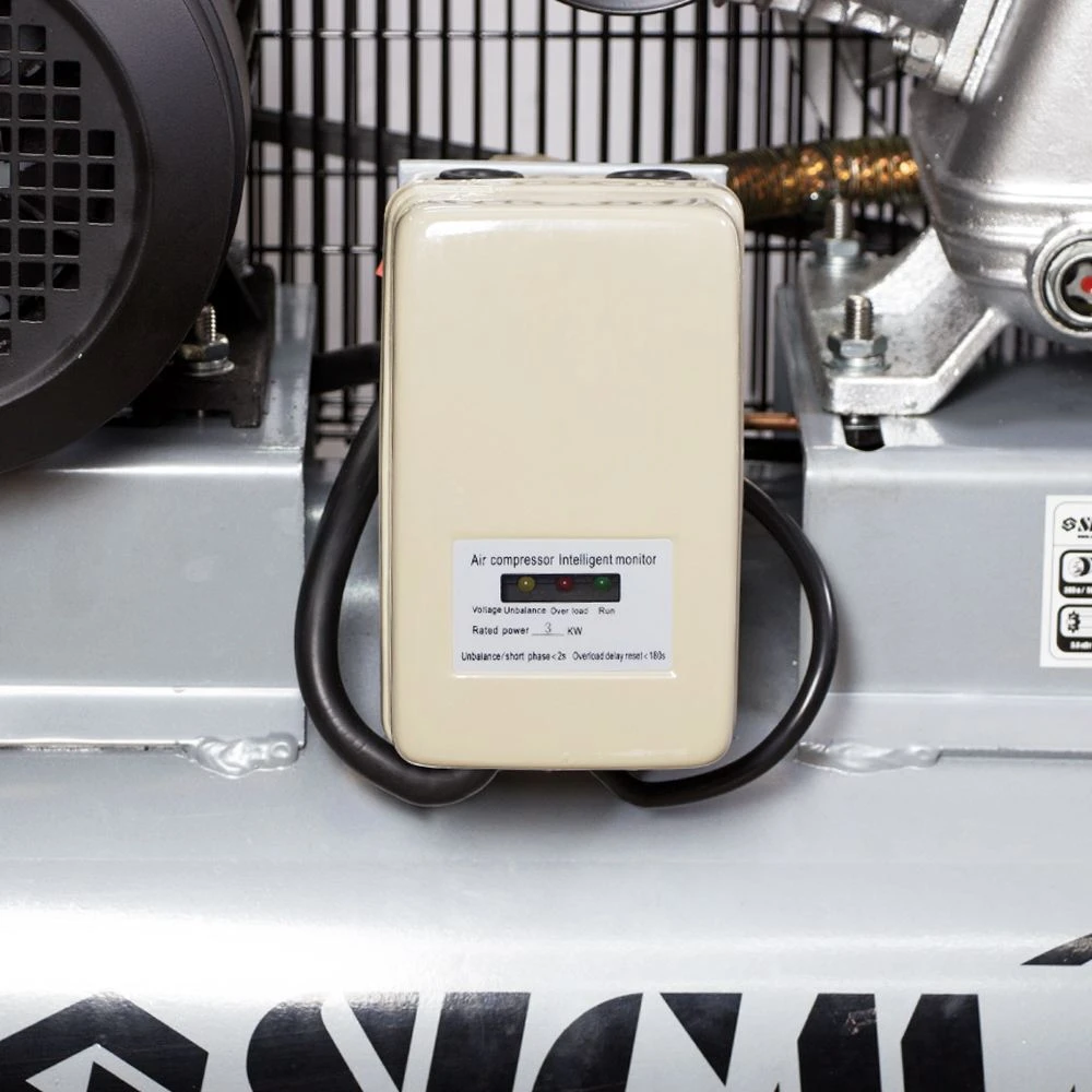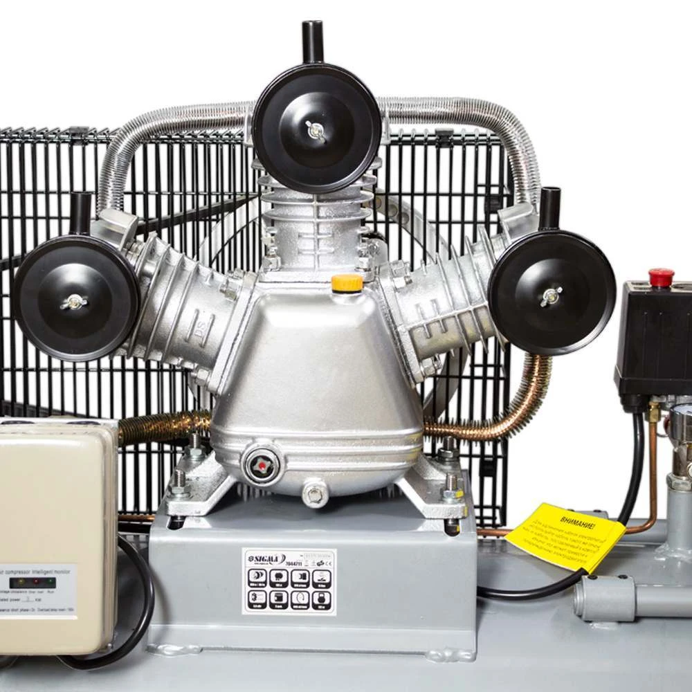Компресор пасової трициліндровий 380В 3кВт 610Л / хв 10бар 135л SIGMA (7044711), призначений для нагнітання стисненого повітря з подальшою його подачею під тиском в різні типи пневмоінструменту і пневмообладнання. Ремінний привід компресора закритий металевим кожухом, який запобігає від попадання сторонніх предметів. Опорна ніжка забезпечує стійке положення на поверхні, а гумова подушечка знижує рівень вібрації. Компресор спроектований для професійного застосування. Застосовується в будівництві і невеликому виробництві, на СТО і майстерень. Ресивер дозволяє накопичувати більший обсягом стисненого повітря, що значно зменшує частоту включення двигуна, зменшуючи навантаження на компресор і відповідно збільшує термін його служби.