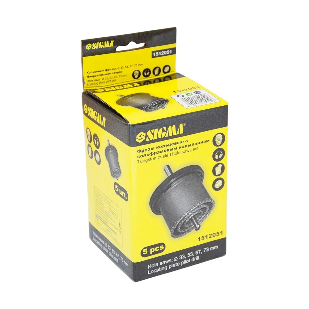 Коронки кільцеві з вольфрамовим напиленням Ø33, 53, 67, 73 мм + основа з свердлом SIGMA (1512051) призначені для свердління отворів в бетоні, цеглі, кераміці, граніті, мармурі, плитці, пластику, пінобетоні і гіпсокартоні в безударном режимі.