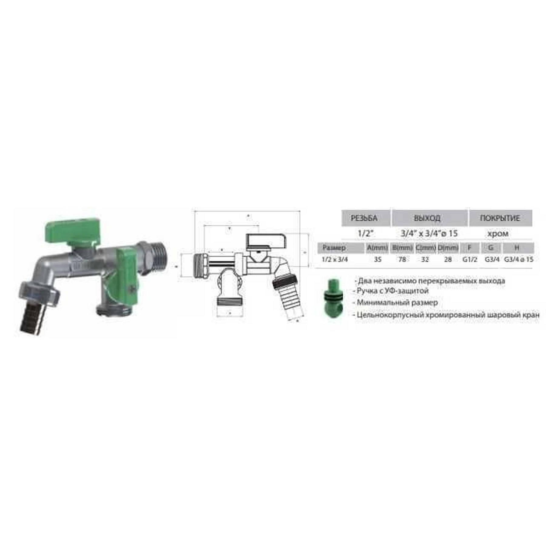 Кран ARCO кульовий для поливу подвійний 1/2″x3/4″x3/4″ 00472 NANO Made in Spain