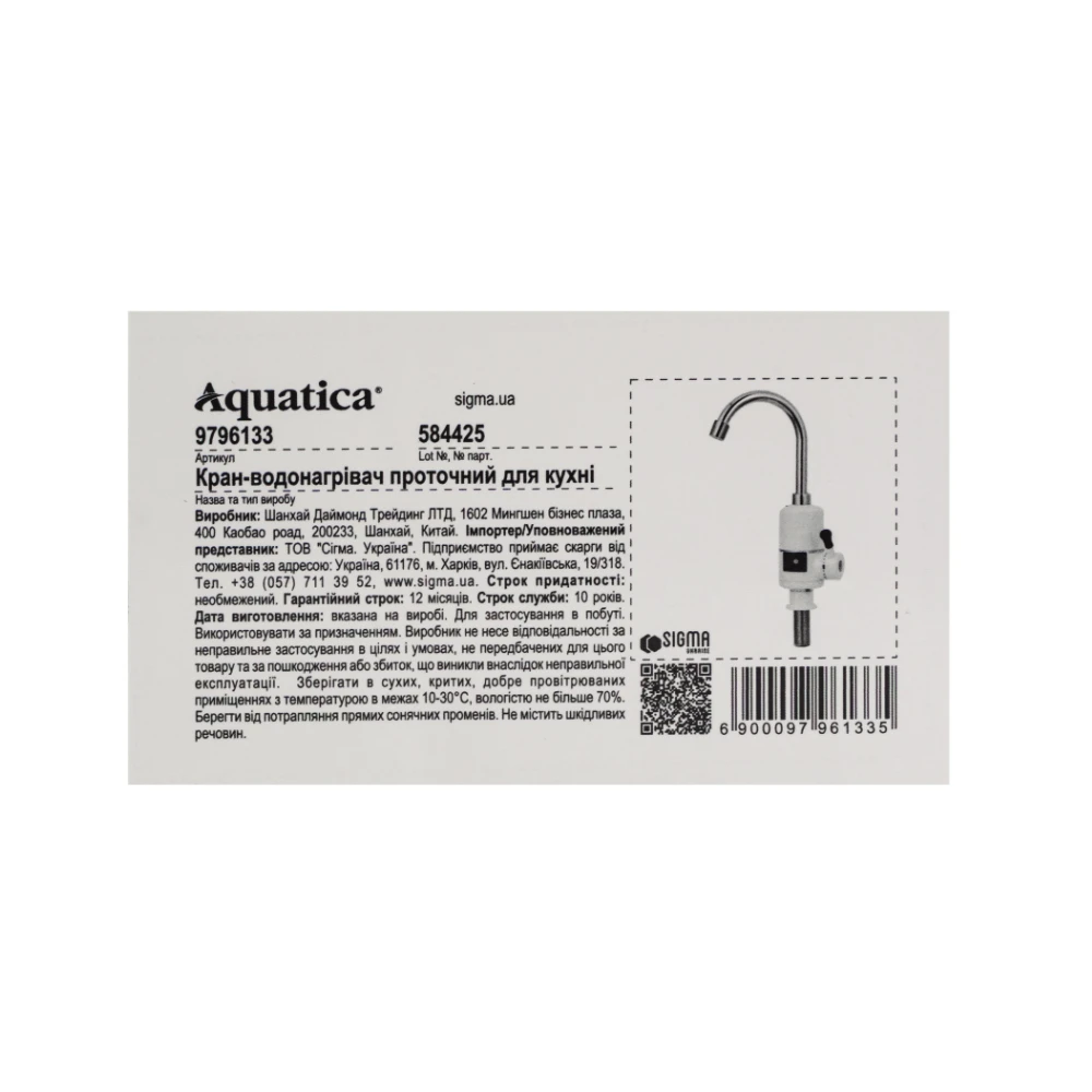Кран-водонагрівач проточний s96 3.3кВт для кухні вилив вухо на гайці з індикатором і термостатом AQUATICA (9796133)