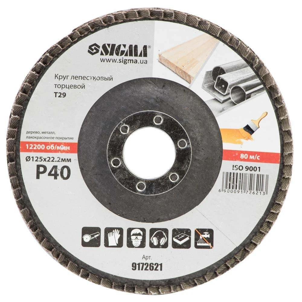 Круг пелюстковий торцевий Т29 (конічний) Ø125мм P40 SIGMA (9172621) призначений для плоского шліфування, обробки кромок зварних швів деталей і конструкцій з різних марок сталей, кольорових металів і деревини. Конічна форма тарілки і кут нахилу пелюсток дозволяє поліпшити якість і швидкість обробки матеріалу.