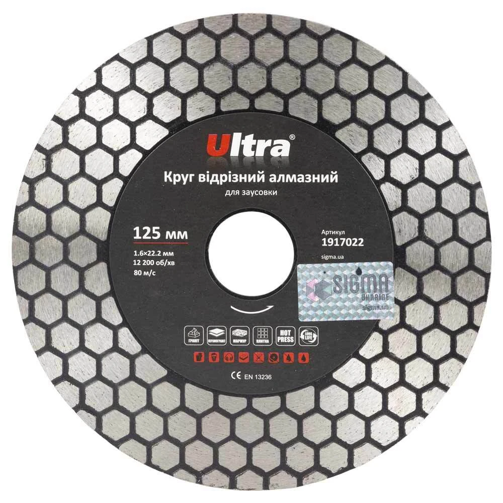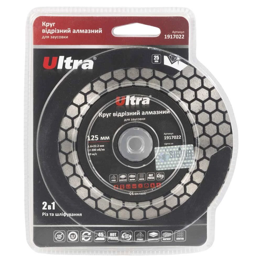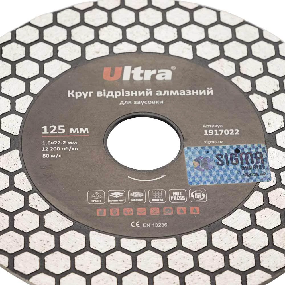 Круг відрізний алмазний для заусовки Ø125×22.2мм ULTRA (1917022) призначений для різання, шліфування та зняття фасок (заусовки) граніту та керамограніту, плитки, мармуру без примусового охолодження. При різі одночасно шліфує кромку, утворюючи чисту поверхню. Корпус виготовлений із міцної сталі, зжатної витримати значне механічне навантаження та високу температуру.