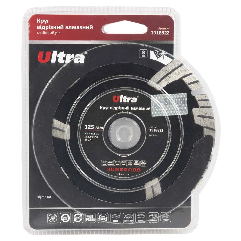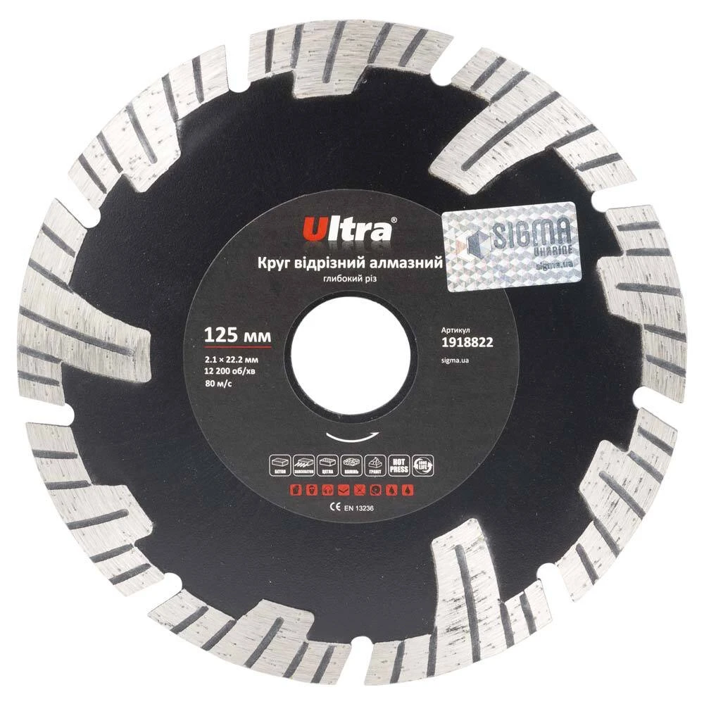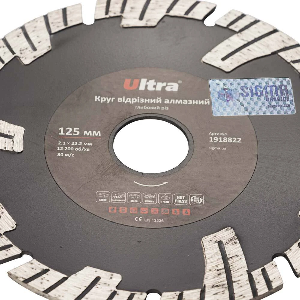 Круг відрізний алмазний Глибокий різ Ø125×22.2мм ULTRA (1918822) призначений для різання бетону, залізобетону, тротуарної плитки, граніту, шиферу, черепиці, цегли, каменю та інших будівельних матеріалів без примусового охолодження. Корпус виготовлений із міцної сталі, здатної витримати значні механічні навантаження та високу температуру. Добре збалансована основа зменшує вібрацію на інструмент та забезпечує високу надійність під час експлуатації.