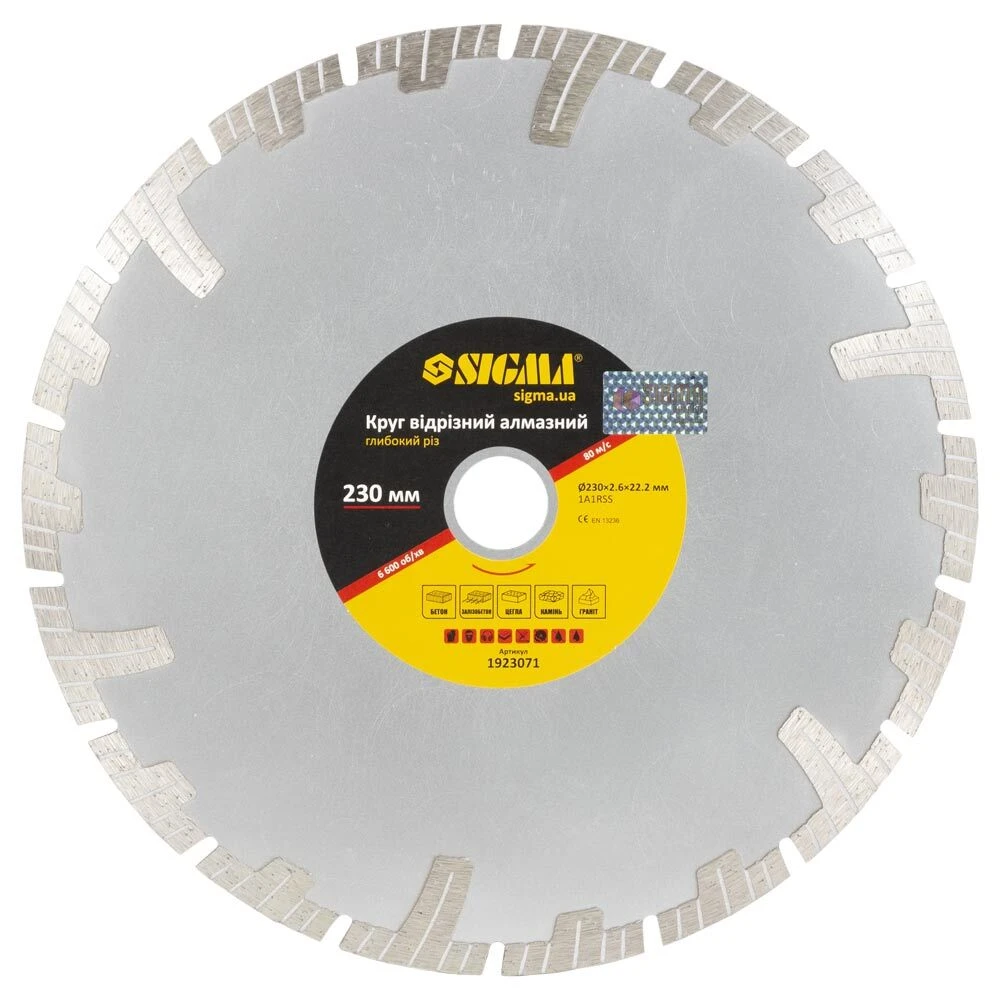 Круг відрізний алмазний Глибокий різ Ø230×22.2мм SIGMA (1923071) призначений для різання бетону, залізобетону, тротуарної плитки, граніту, шиферу, черепиці, цегли, каменю та інших будівельних матеріалів без примусового охолодження. Корпус виготовлений із міцної сталі, здатної витримати значні механічні навантаження та високу температуру.