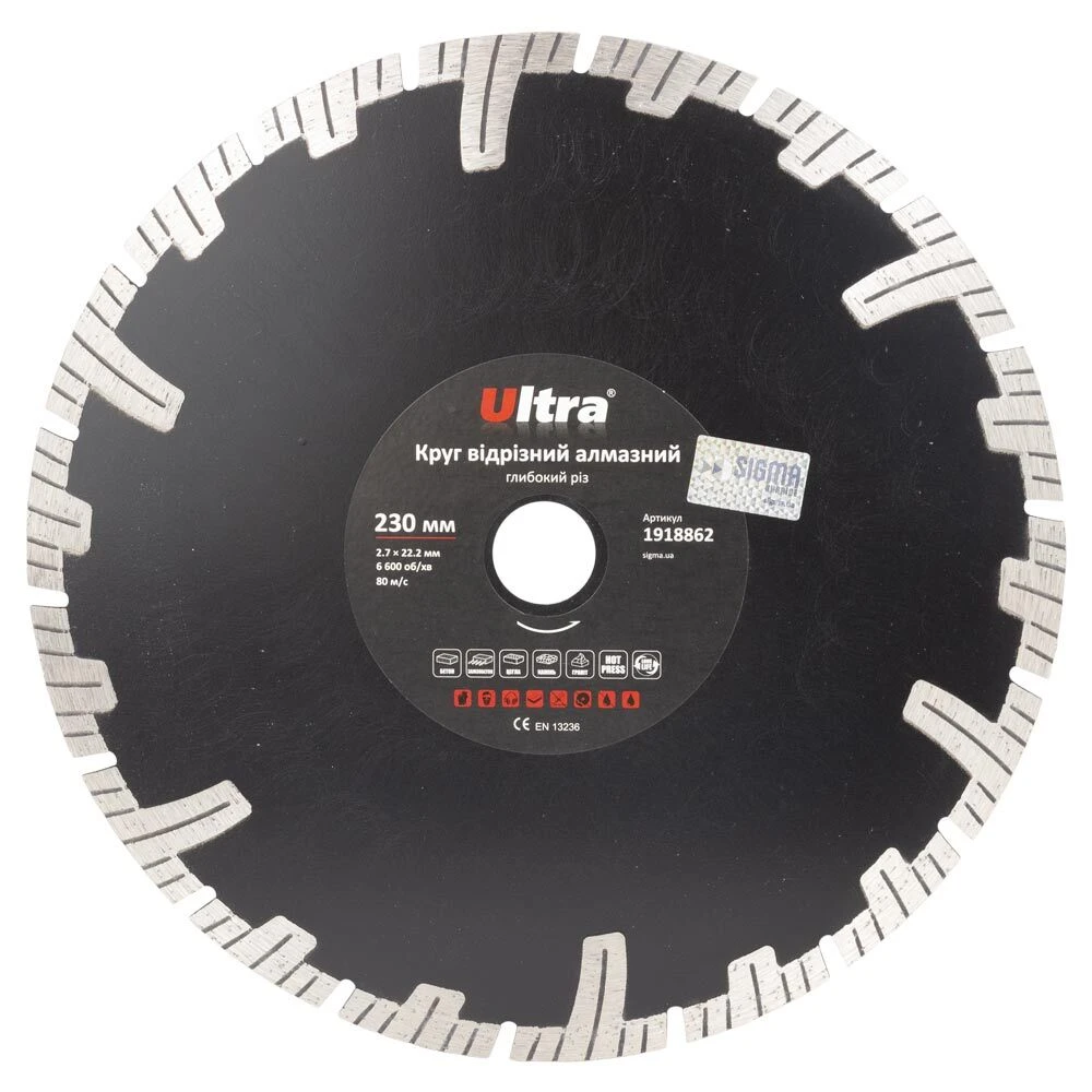 Круг відрізний алмазний Глибокий різ Ø230×22.2мм ULTRA (1918862) призначений для різання бетону, залізобетону, тротуарної плитки, граніту, шиферу, черепиці, цегли, каменю та інших будівельних матеріалів без примусового охолодження. Корпус виготовлений із міцної сталі, здатної витримати значні механічні навантаження та високу температуру. Добре збалансована основа зменшує вібрацію на інструмент та забезпечує високу надійність під час експлуатації.