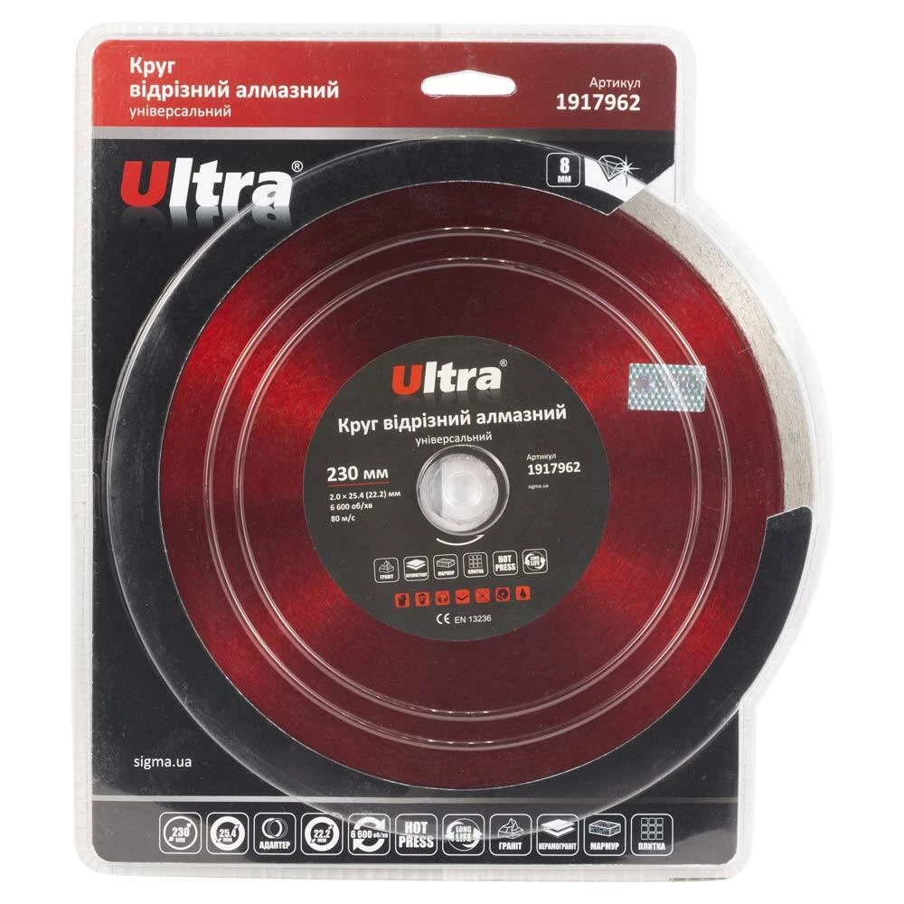 Круг відрізний алмазний універсальний Ø230××25.4 (22.2)мм ULTRA (1917962) призначений для різання граніту та керамограніту, кахлю, плитки, мармуру, каменю з примусовим охолодженням. Корпус виготовлений із міцної сталі, здатної витримати значне механічне навантаження та високу температуру. Добре збалансована основа зменшує вібрацію на інструмент та забезпечує високу надійність під час експлуатації.