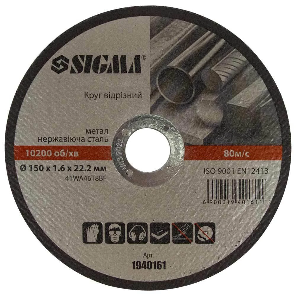 Круг відрізний по металу та нержавіючої сталі Ø150×1.6×22.2мм, 10200об/хв SIGMA (1940161) призначений для різання виробів з металів і нержавіючої сталі, роботи з кузовний сталлю і іншими аналогічними матеріалами. Робочим інструментом при роботі відрізного кола є кутова шліфувальна машина (КШМ, "болгарка").