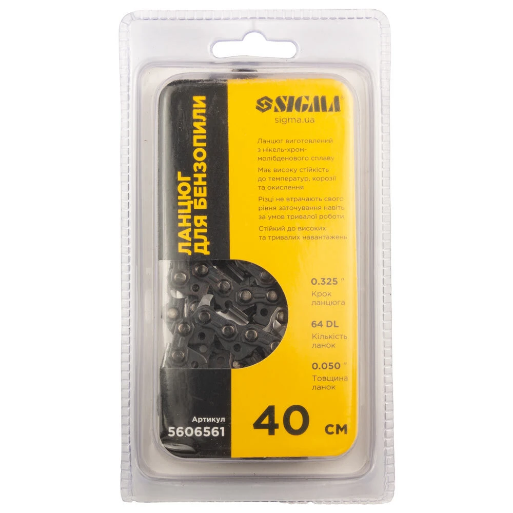 Ланцюг для бензопили 40см крок ланцюга 0.325 паз 1.3мм 64DL напівчизель SIGMA (5606561) призначений для різання деревини та інших матеріалів. Він складається із зубів, які обертаються навколо напрямної шини, створюючи силу, яка ріже матеріал.