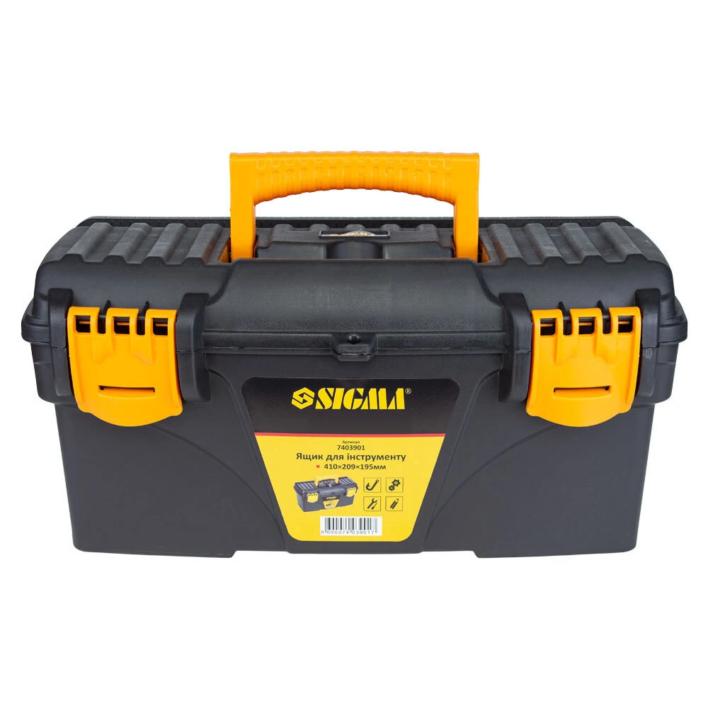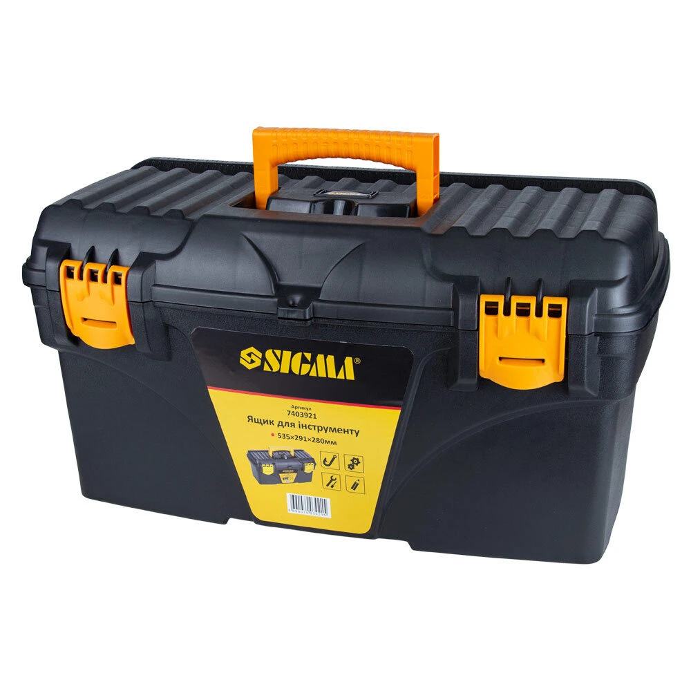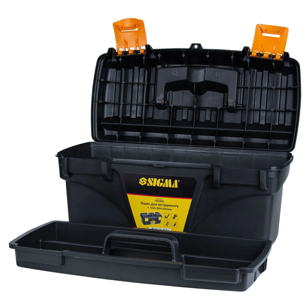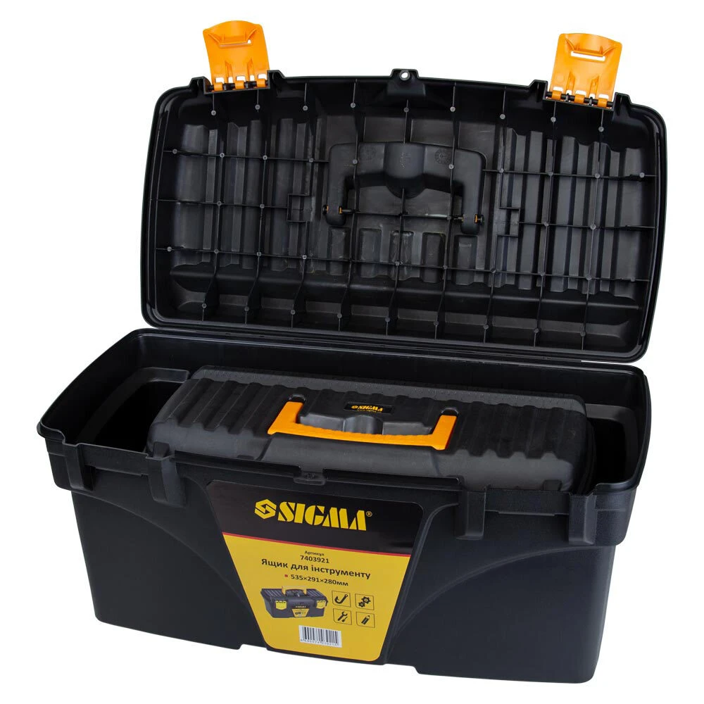 Набір ящиків для інструменту 2в1 410×209×195мм, 535×291×280мм SIGMA (7403881) - включає 2 ящика різних розмірів. Призначені для зберігання, транспортування, перенесення і зручного доступу до ручного інструменту. Допомагають системно організувати зберігання дрібних деталей: кріплення, шайб, гайок та інших дрібниць. Простота в пошуку необхідних деталей забезпечується наявністю декількох секцій. Функціональні і знаходять застосування в багатьох сферах діяльності: перенесення індивідуальних інструментів, комплектація наборів інструментів і дрібних деталей для домашнього майстра, забезпечення працівників комунальних служб комплектом устаткування, при комплектації необхідного набору інструментів для автомобіля та ін.
