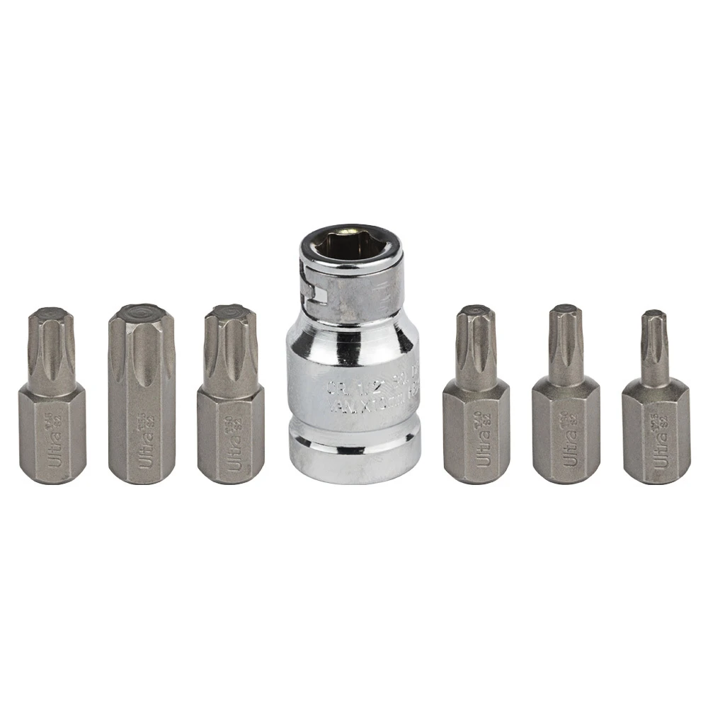 Набір біт TORX 10мм 7шт S2 (пласт кейс) ULTRA (4016902) призначені для професійного використання. Виготовлені з легованої інструментальної сталі S2 з поверхневим зміцненням до твердості 58-61 HRC струмами високої частоти (СВЧ). Мають проточенну головну частину для роботи у вузьких місцях.