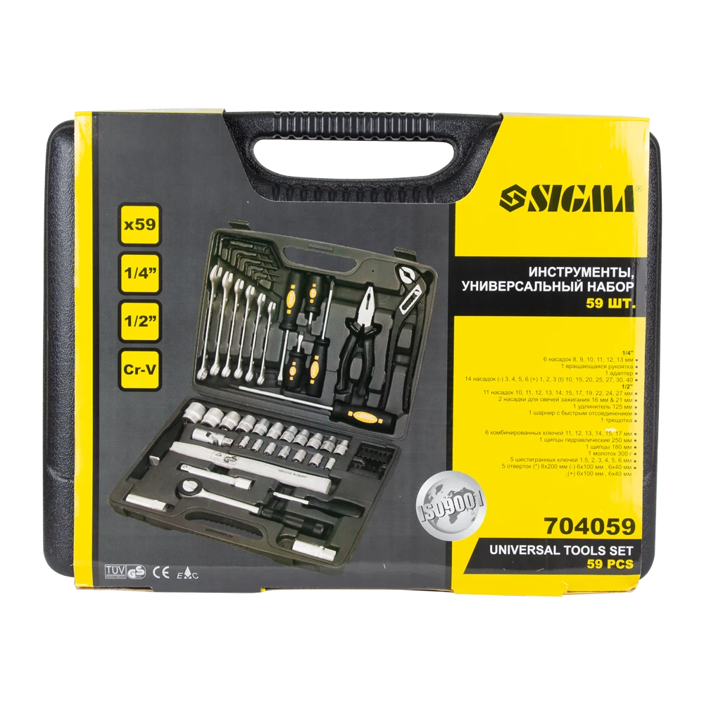 Набір інструментів, ключів, насадок торцевих і біт 1/4", 1/2" 59шт CrV Taiwan SIGMA (6001031) призначений для роботи з різьбовими з'єднаннями при ремонті і обслуговуванні автомобілів. Інструменти виготовлені з вуглецевої сталі і мають оцинковане покриття. Поставляються в компактному пластмасовому футлярі.