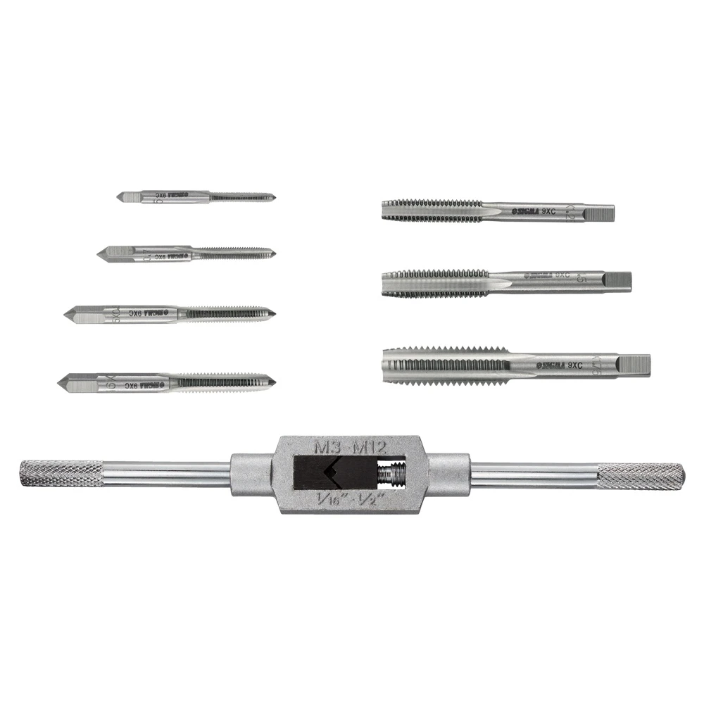 Набір мітчиків 8 предметів SIGMA (1640061) призначений для нарізування внутрішніх різьблень. Являє собою гвинт з прорізаними стружковими канавками, що утворюють ріжучі кромки. Хвостовою частиною кріпитися в тримач для мітчиків (комірець), робочою частиною вводиться в отвір, в якому при провертанні власника зворотно-поступальними рухами нарізається різьба. При нарізанні, різьблення, попередньо, змащують консистентним мастилом.