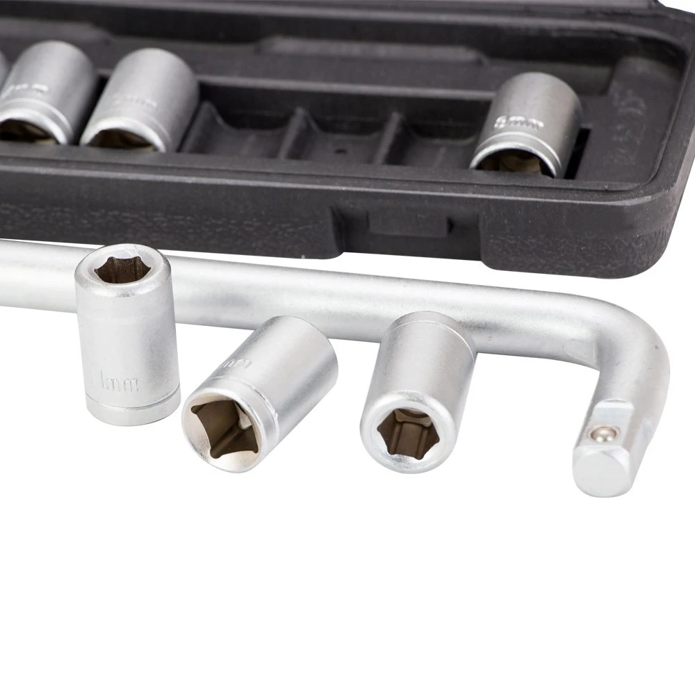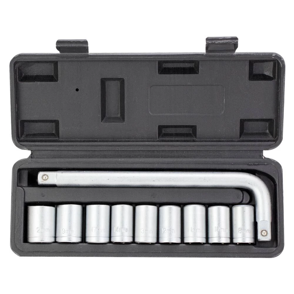 Набір насадок торцевих 1/2" 9шт + вороток (кейс) GRAD (6003035) призначений для роботи з різьбовими з'єднаннями при ремонті і обслуговуванні автомобілів. Інструменти виготовлені з хромванадієва стали. Поставляються в компактному пластмасовому кейсі.