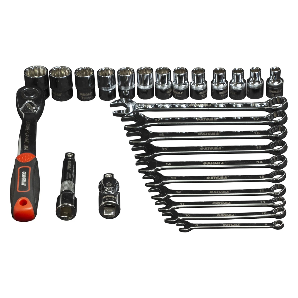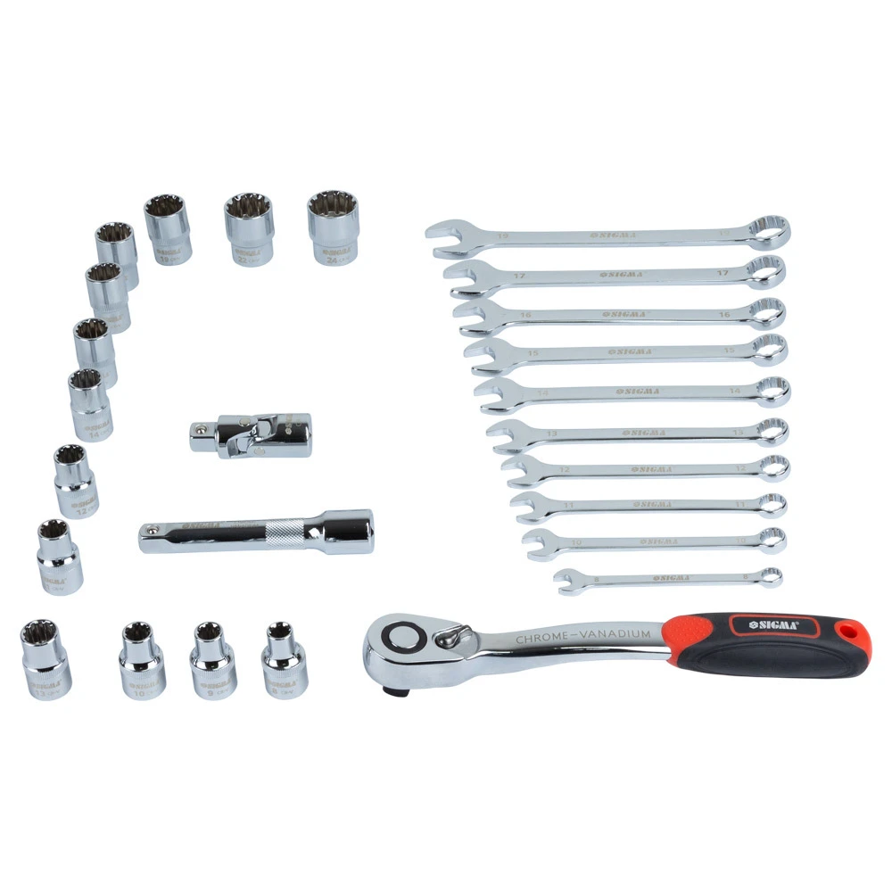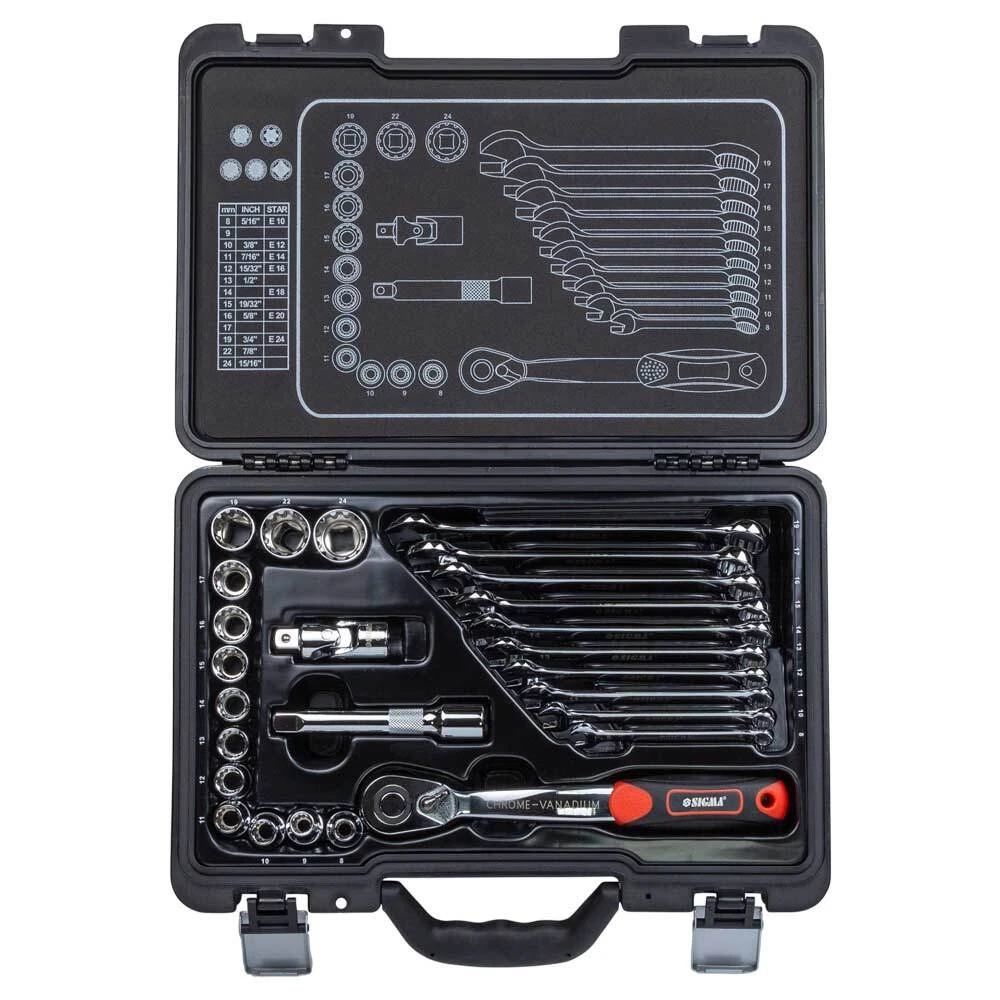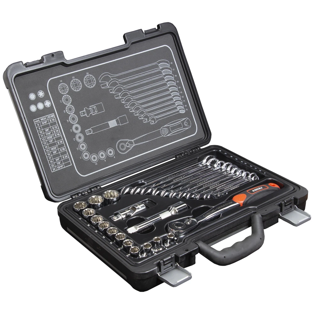 Усі елементи виготовлені з високоякісної хромованадієвої сталі CrV 50BV30. Відмінною рисою даної марки сталі є велика кількість легуючих добавок, завдяки чому матеріал стає менш схильним до крихкого руйнування та збільшує надійність при експлуатації. Тришарове хромонікелеве покриття збільшує термін служби інструменту та запобігає корозії. Комплект містить оптимальний набір пристосувань для виконання різних видів робіт у майстерні, на автосервісі, гаражі або СТО, а також для різноманітних побутових потреб.