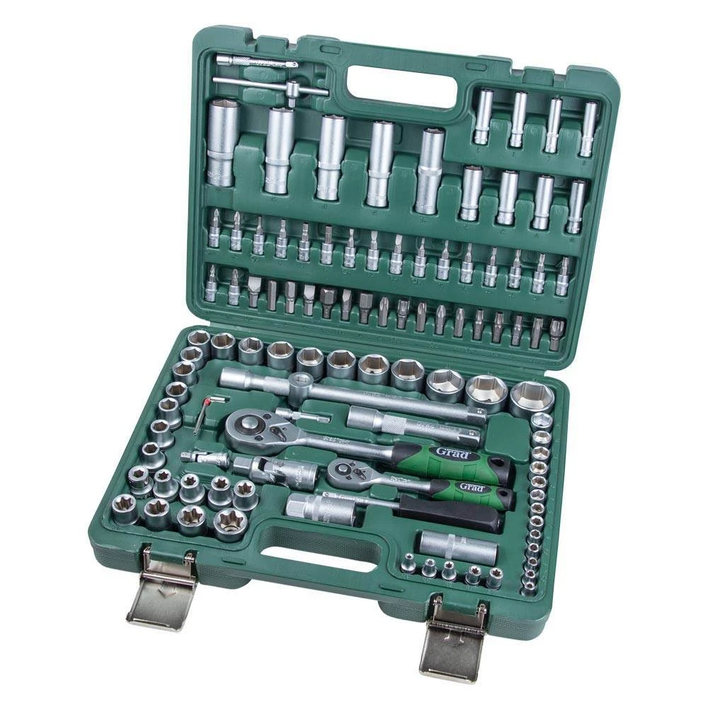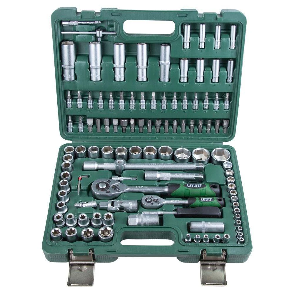 Набори GRAD - лінійка для побутового використання. Набори підходять як для виконання нескладного автомобільного ремонту, так і для побутового застосування. Інструменти виготовлені з міцної інструментальної сталі і мають тришарове покриття (Nickel X2 + Chrome).