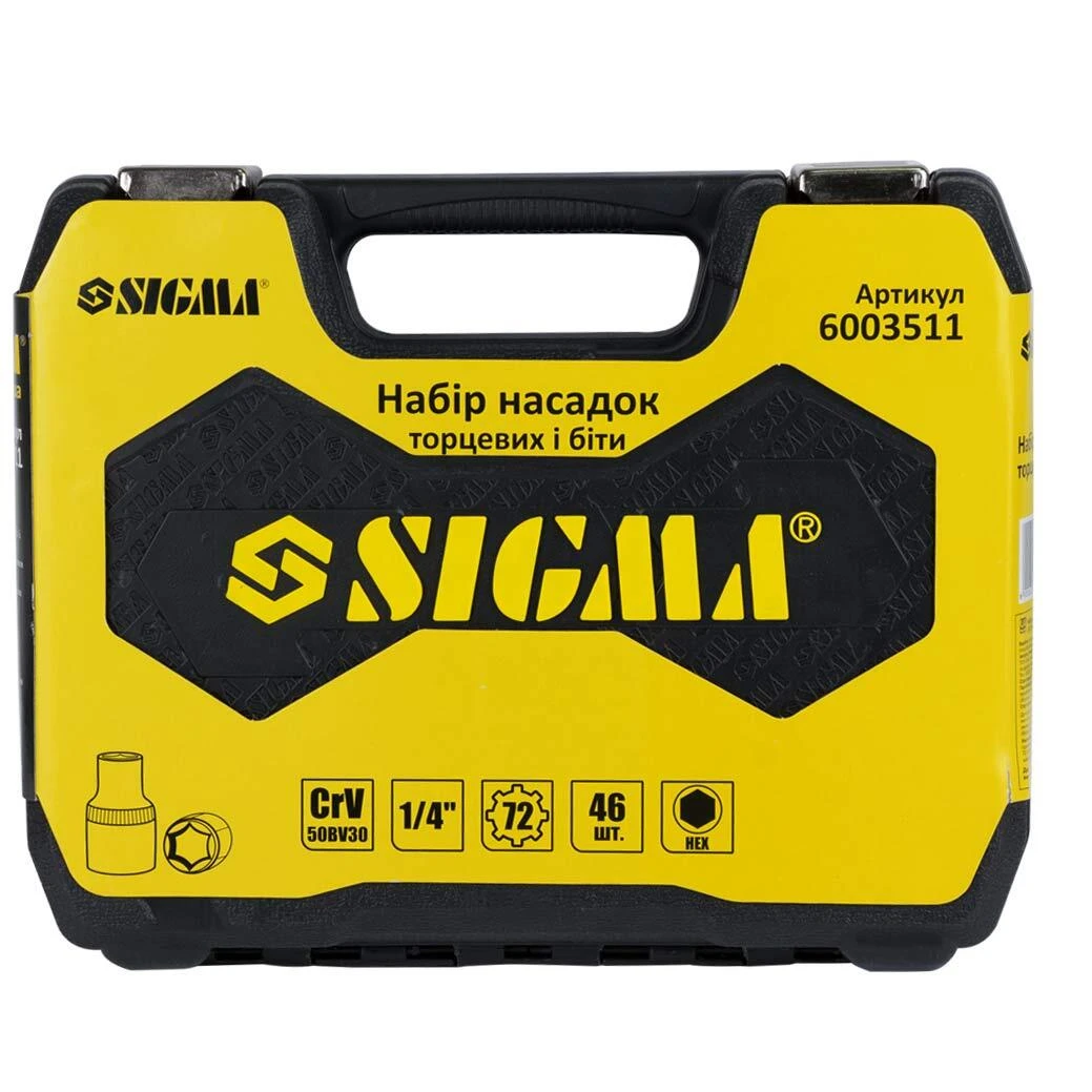 Набір насадок торцевих і біт 1/4" 46шт CrV mid SIGMA (6003511) призначений для роботи з різьбовими з'єднаннями при ремонті і обслуговуванні автомобілів. Інструменти виготовлені з хромванадієва стали і мають матове покриття. Поставляються в ударопрочном, пластмасовому кейсі.