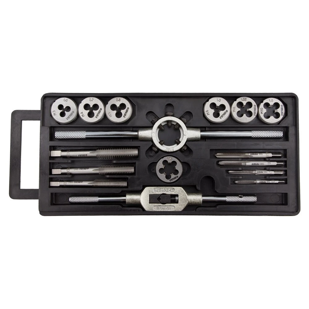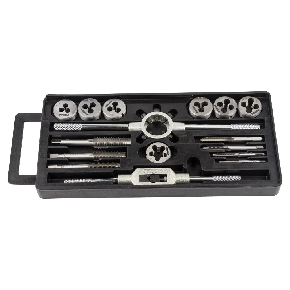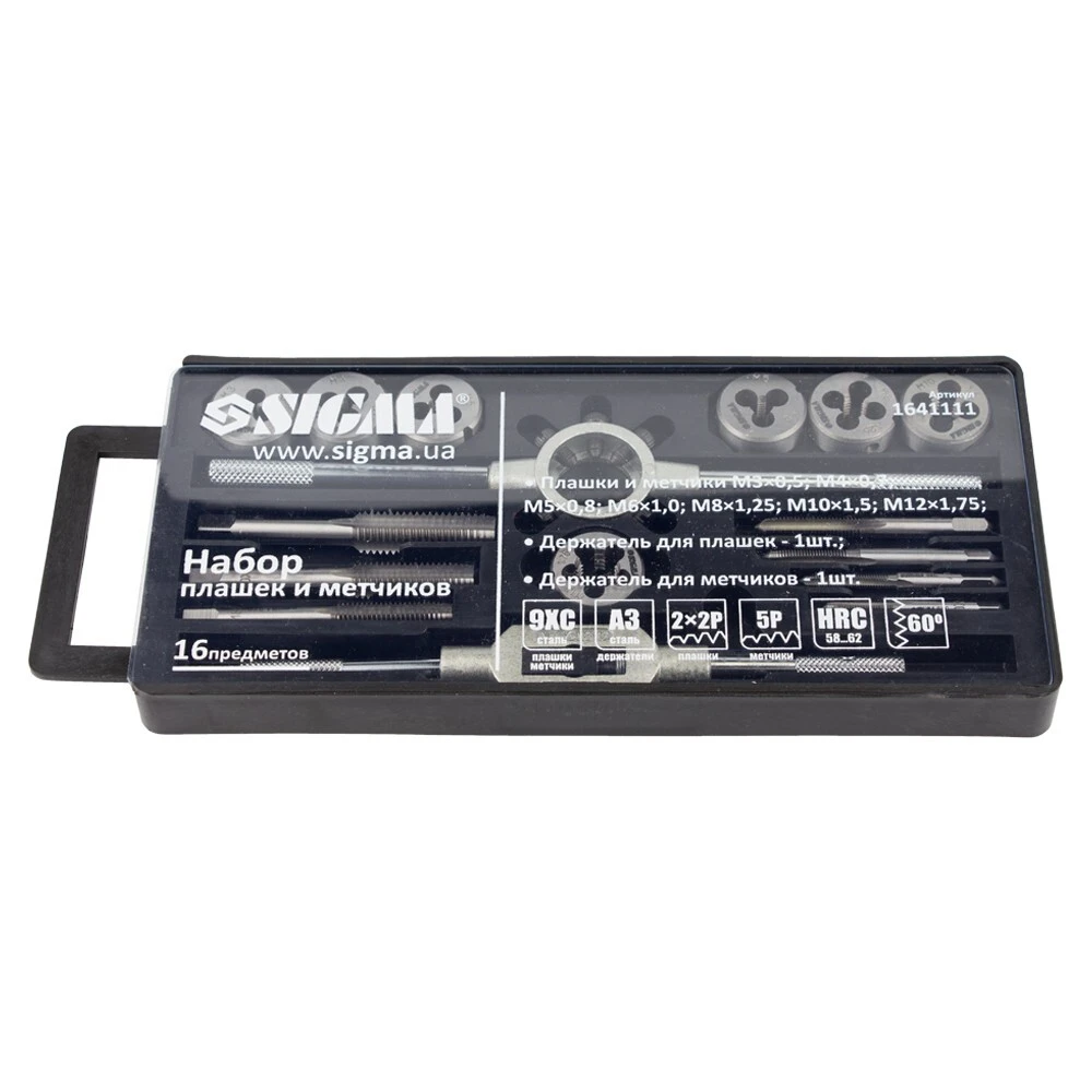 Набір плашок і мітчиків 16 предметів (пластиковий кейс) SIGMA (1641111) призначений для нарізування внутрішньої та зовнішньої метричної різьби на металевих виробах, для калібрування і відновлення пошкоджених ділянок різьблення. При нарізанні, різьблення, попередньо, змащують консистентним мастилом.