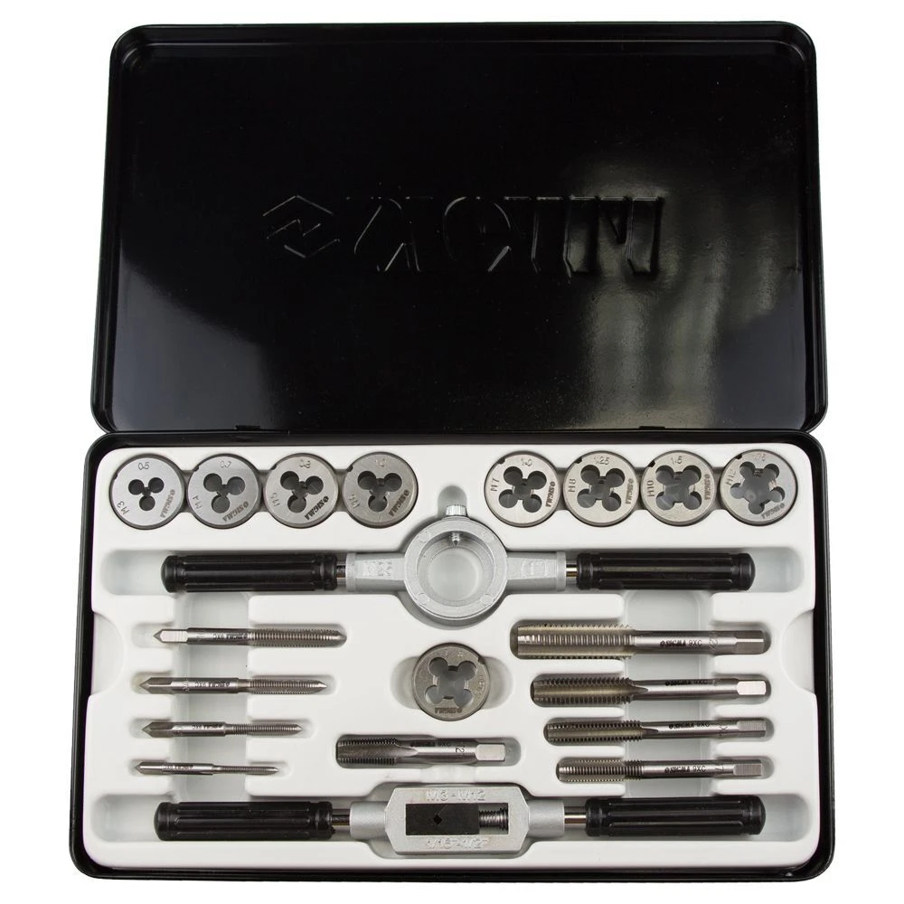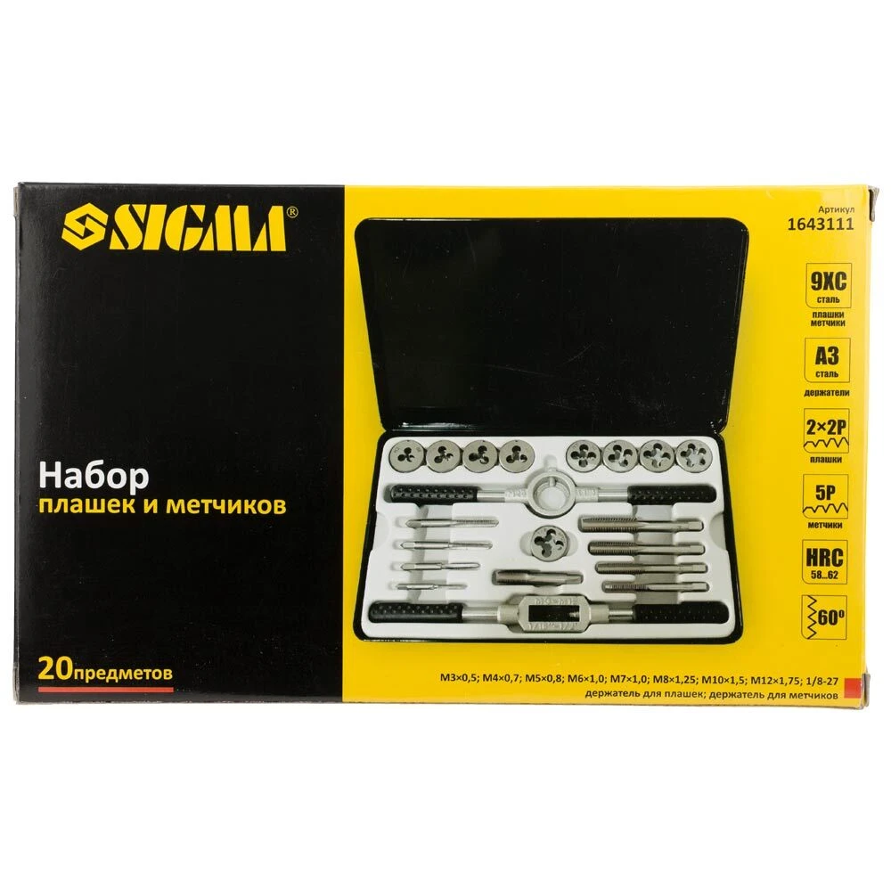 Набір плашок і мітчиків 20 предметів (металевий кейс) SIGMA (1643111) призначений для нарізування внутрішньої та зовнішньої метричної різьби на металевих виробах, для калібрування і відновлення пошкоджених ділянок різьблення. При нарізанні, різьблення, попередньо, змащують консистентним мастилом.