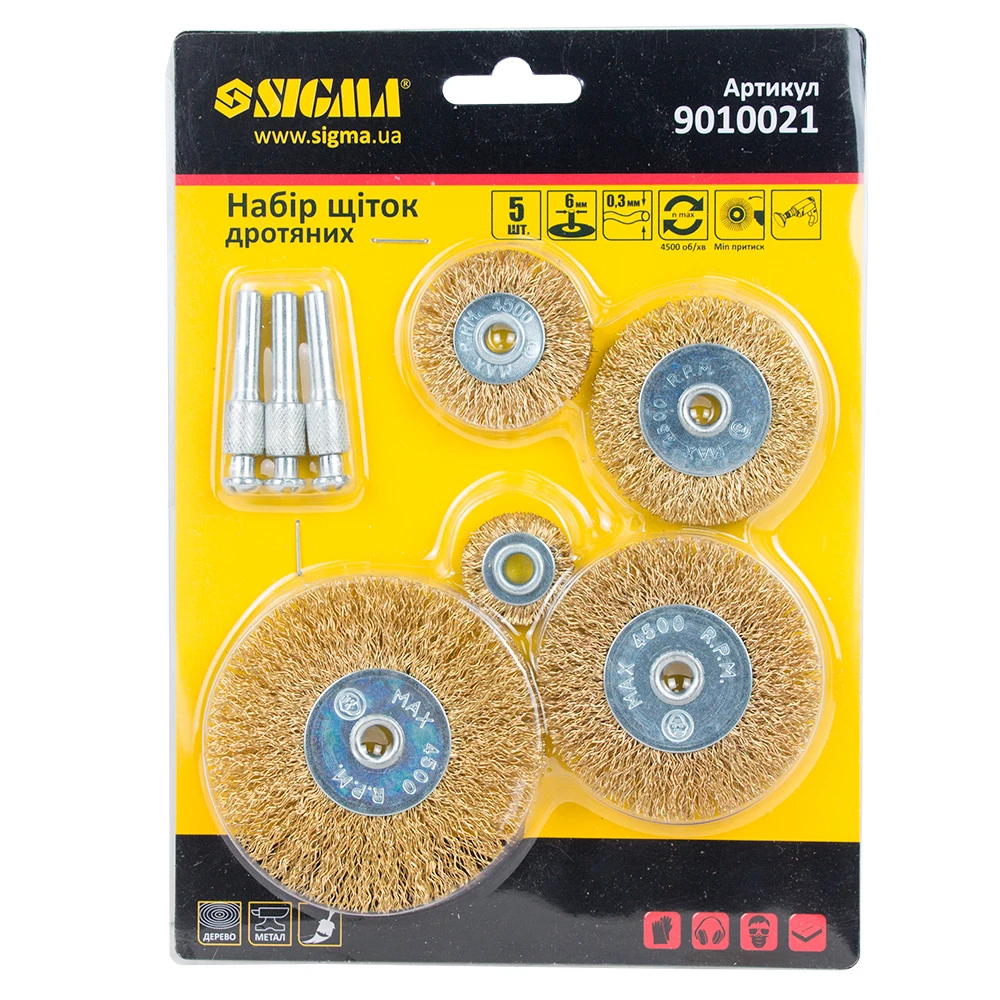 Набір щіток дротяних 5шт Ø25; 38; 50 ;65; 75мм хвостовик Ø6мм (латуновані) SIGMA (9010021) призначений для зачистки поверхонь від лакофарбових покриттів, іржі, окалини, різних забруднень, зачистки зварних швів.