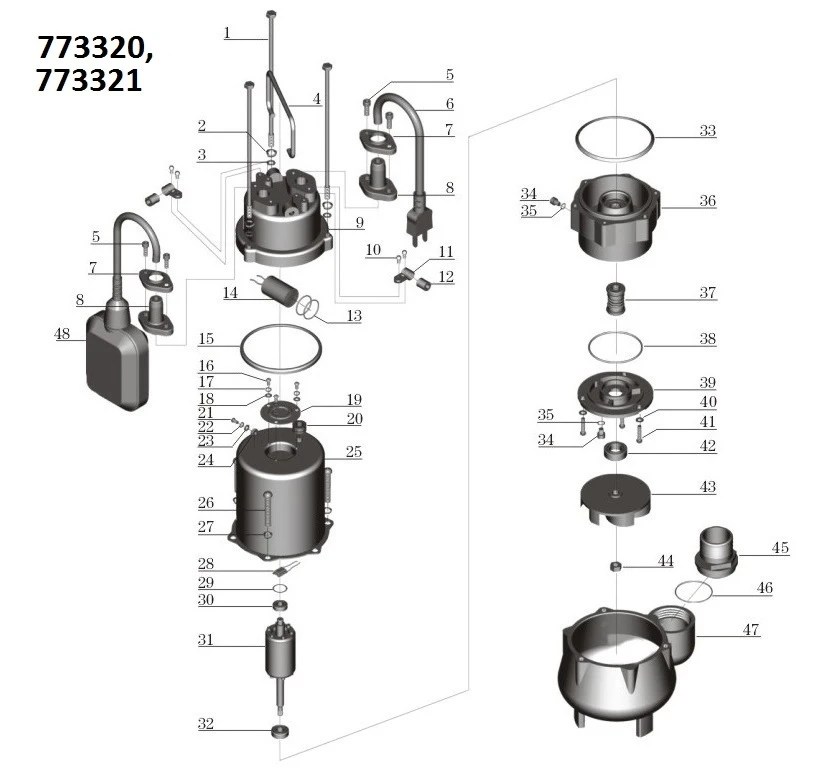 - Поплавковий вимикач забезпечує автоматичне включення і виключення насосів даної серії в залежності від рівня води