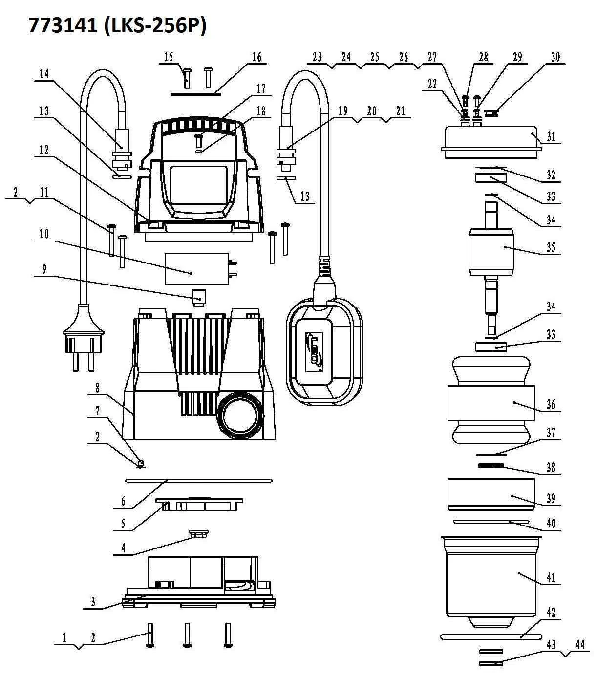 - Поплавковий вимикач забезпечує автоматичне включення і виключення насосів даної серії в залежності від рівня води.