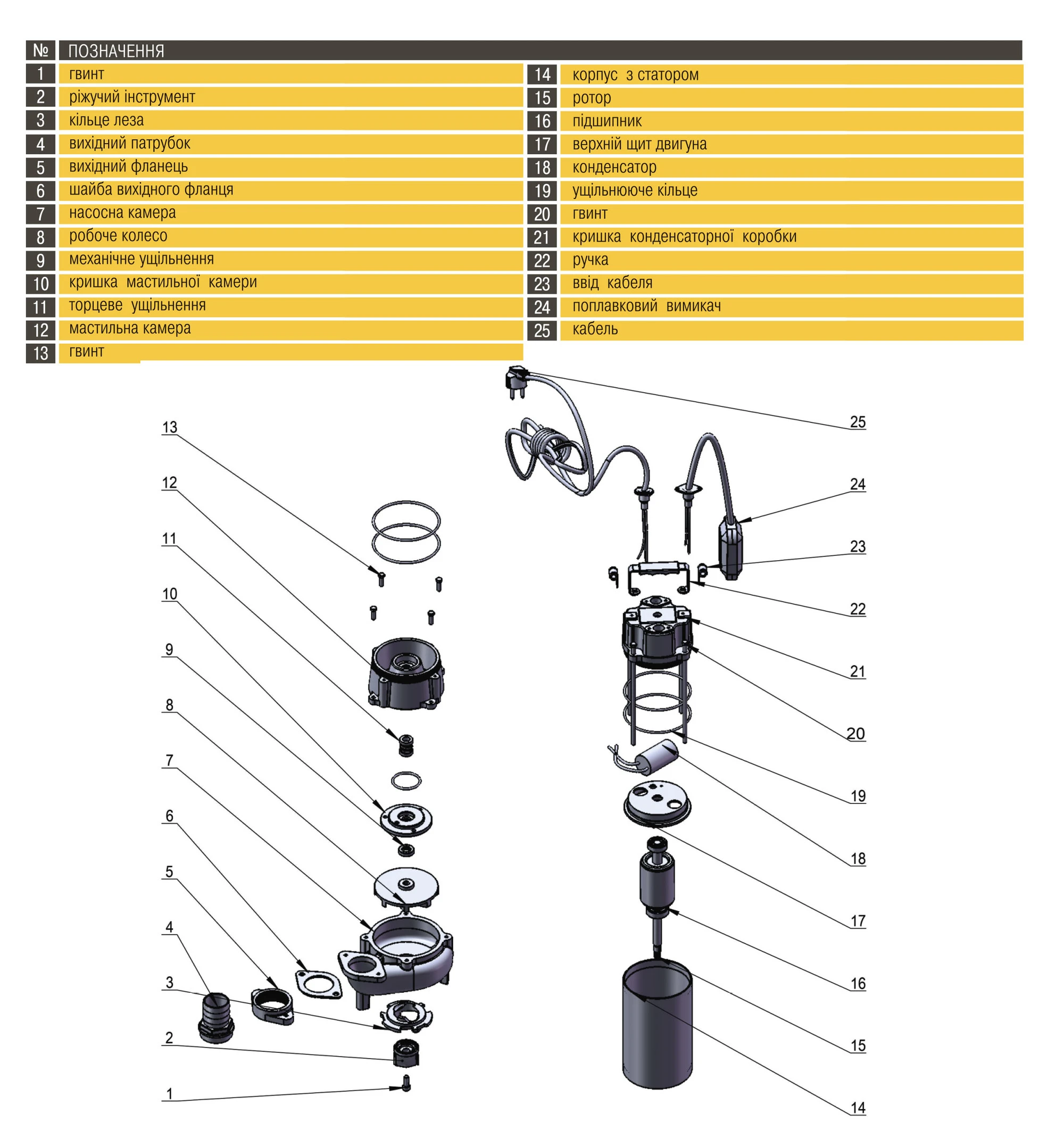 Корпус насосної частини і робоче колесо виготовлено з чавуну. Надійність елементів ущільнювачів фекального насоса повністю ізолює електродвигун від контакту з рідиною, що перекачується і захищає від надлишкових тепла і вологи. Наявність таких особливостей, як подвійне торцеве ущільнення валу в маслозаповнений камері і маслозаповненому двигуні гарантують охолодження насоса навіть у разі його занурення в рідину менш ніж на половину. Робоче колесо з ріжучим механізмом дозволяє подрібнювати різні відходи, які транспортуються зі стічними водами - шматки тканини, шнури і інше. Також насос обладнаний поплавковим вимикачем, який забезпечує роботу насоса в автоматичному режимі. Напруга мережі: 230V-50Hz. Термозахисне реле вбудоване у виносний блок.