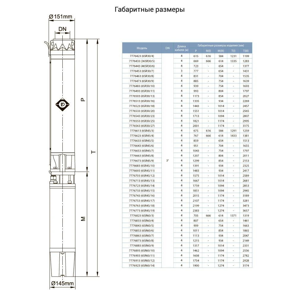 Насос відцентровий свердловинний 380В 7.5кВт H 104 (58) м Q 665 (500) л / хв Ø151мм AQUATICA (DONGYIN) (7776453)