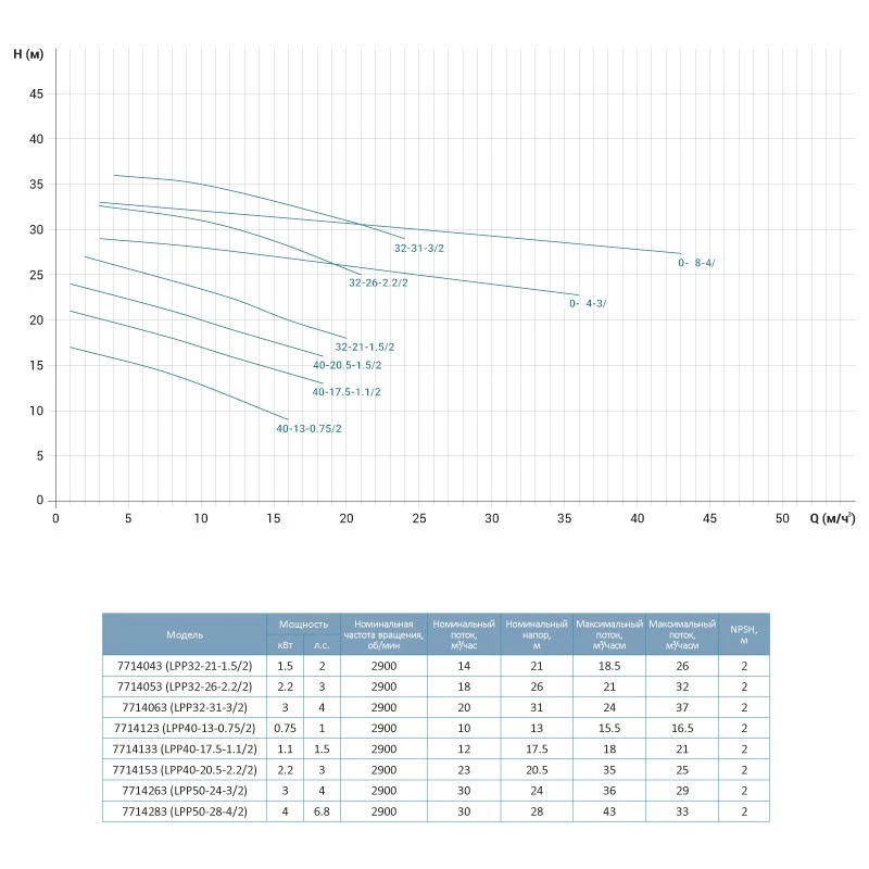 Рядний електронасос при споживаної номінальної потужності 4000Вт здатний створювати максимальний напір - 32.5м і максимальну продуктивність - 717л / хв, що відповідає - 43.02 кубічних метрів на годину.